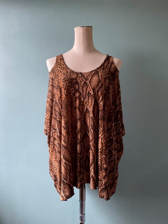 ヘビ柄アセテートトップス。 身幅の広いスクエア型でだるーんと下に落ちるシルエットです。 肩がちょっと出るのがポイントです。肌に張り付かないさらっとした材質です。 ************************** ・サイズ 全て平置き採寸 着丈62cm、身幅72cm、 生地の伸縮性 よく伸びる ・素材 95% ACETATE 5% ELASTHANNE ・製造国 MADE IN FRANCE ~~~採寸はあくまで目安です多少の誤差はご容赦ください~~~ ◇コンディション 特筆すべきダメージはありません used、vintageの商品の為細かなスレ、痛み、使用感、見落としてしまうようなダメージがある場合もあります。古着の特性を理解の上でのご購入をお願いいたします。(初めてご購入されるお客様はショップの説明を必ず読んでから、ご利用ください。)