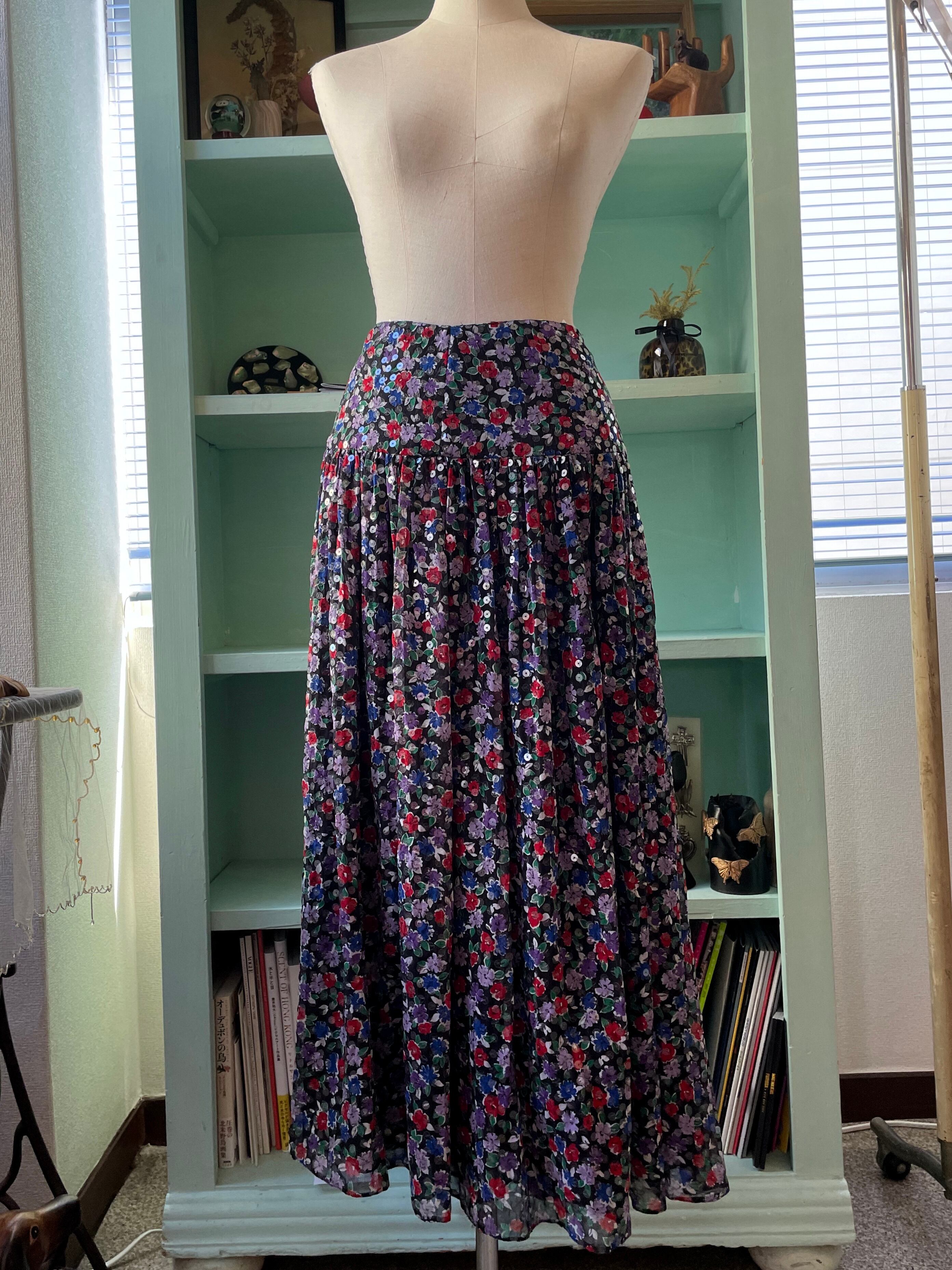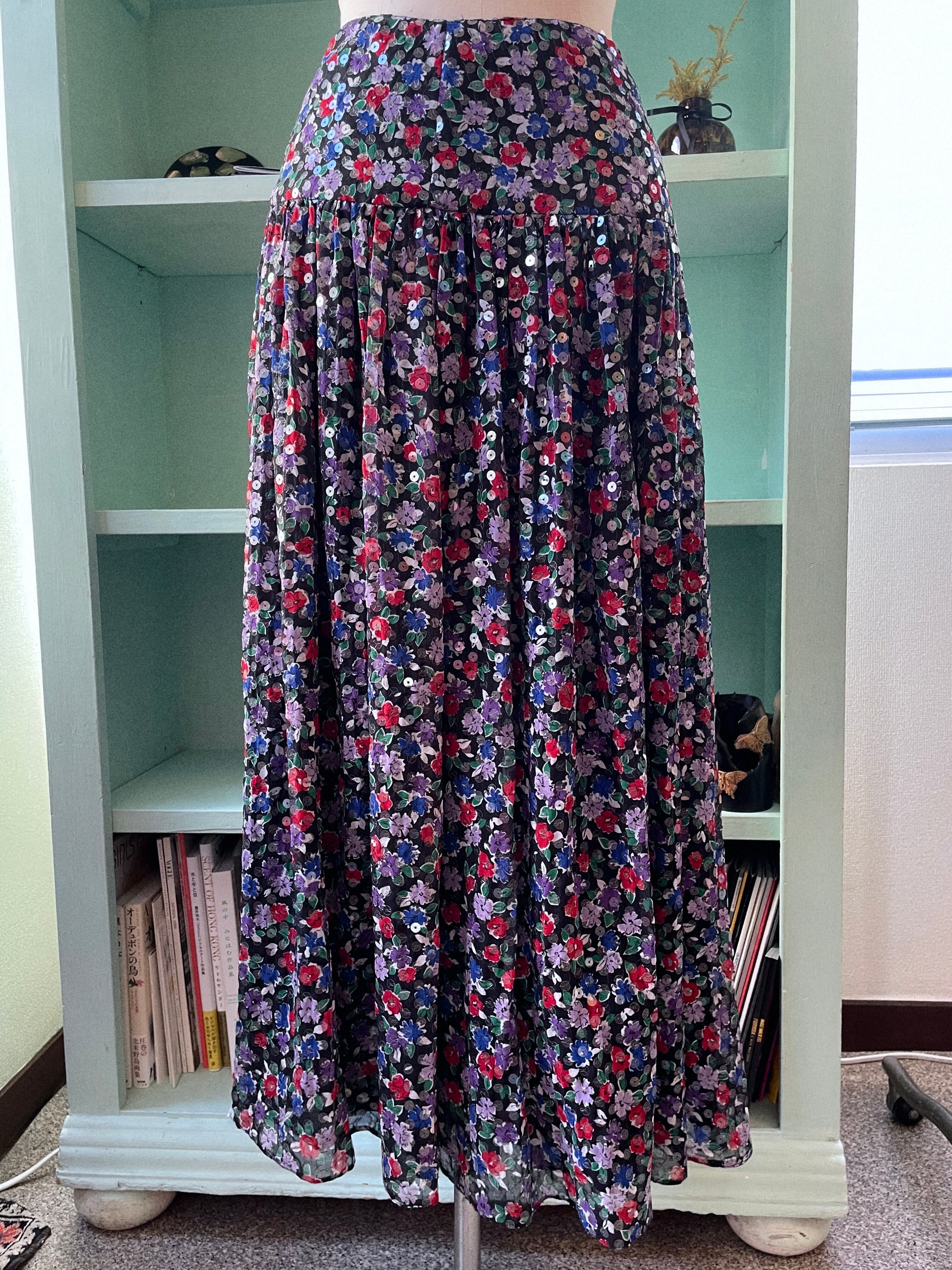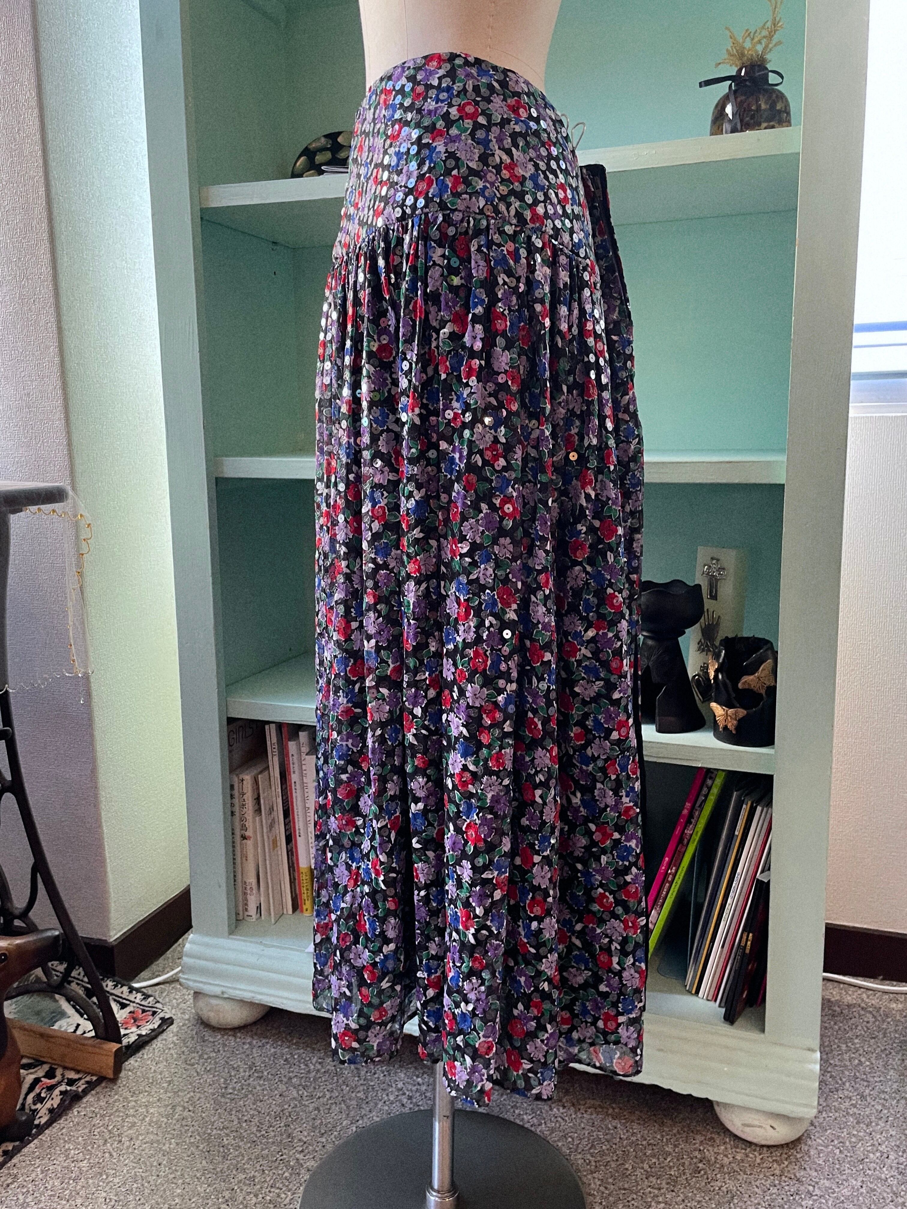 黒ベースの花柄テキスタイルにクリアのスパンコールが装飾されたスカート。