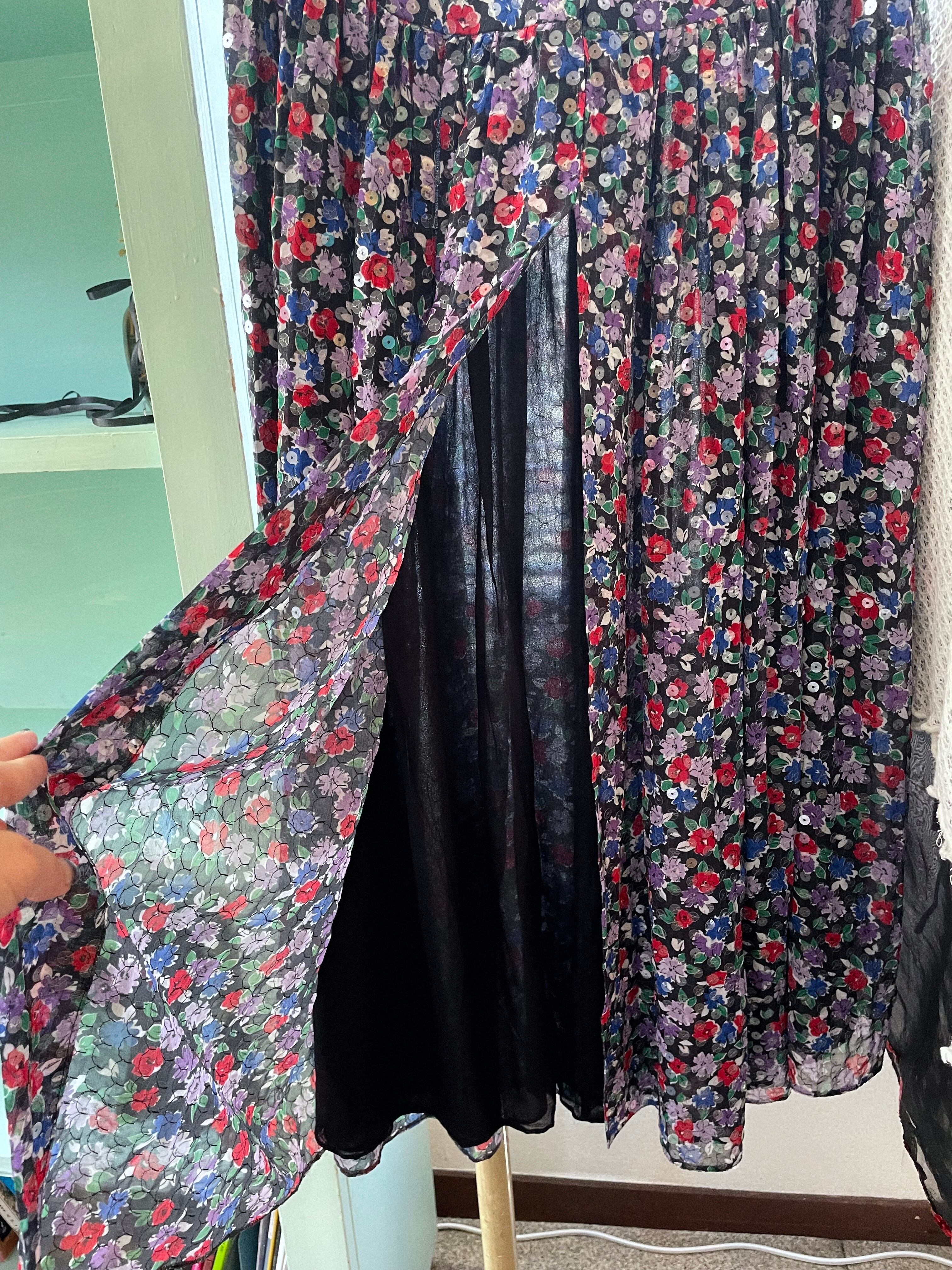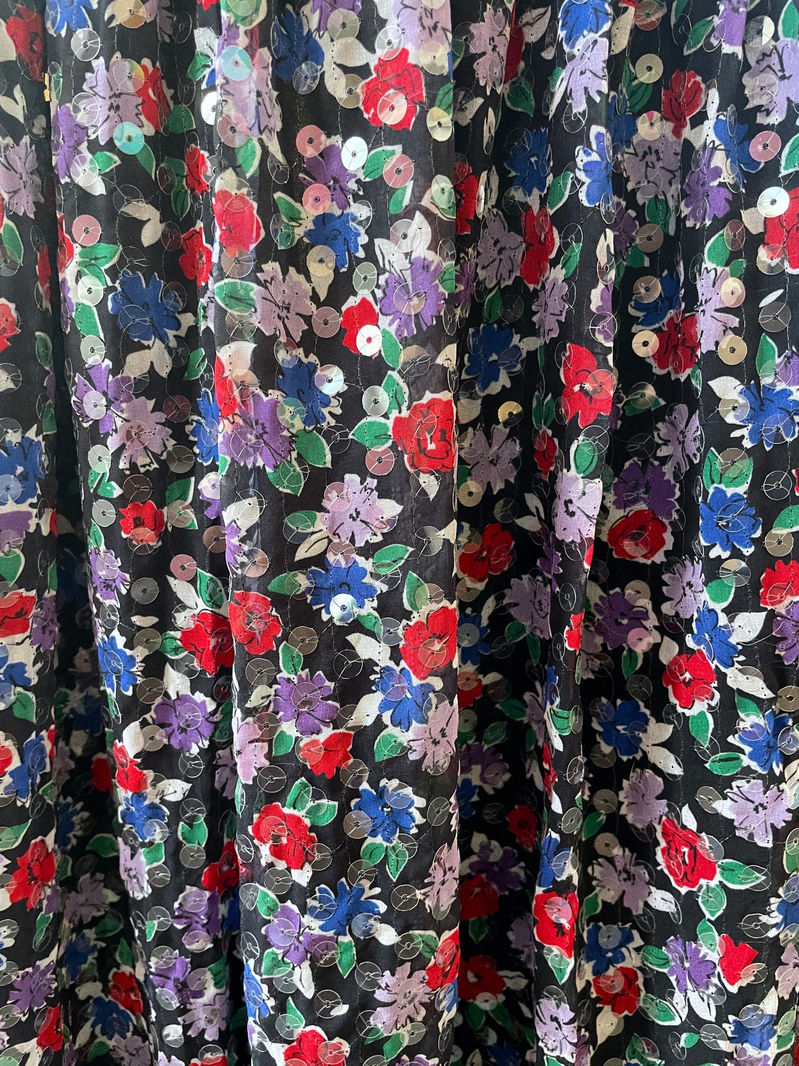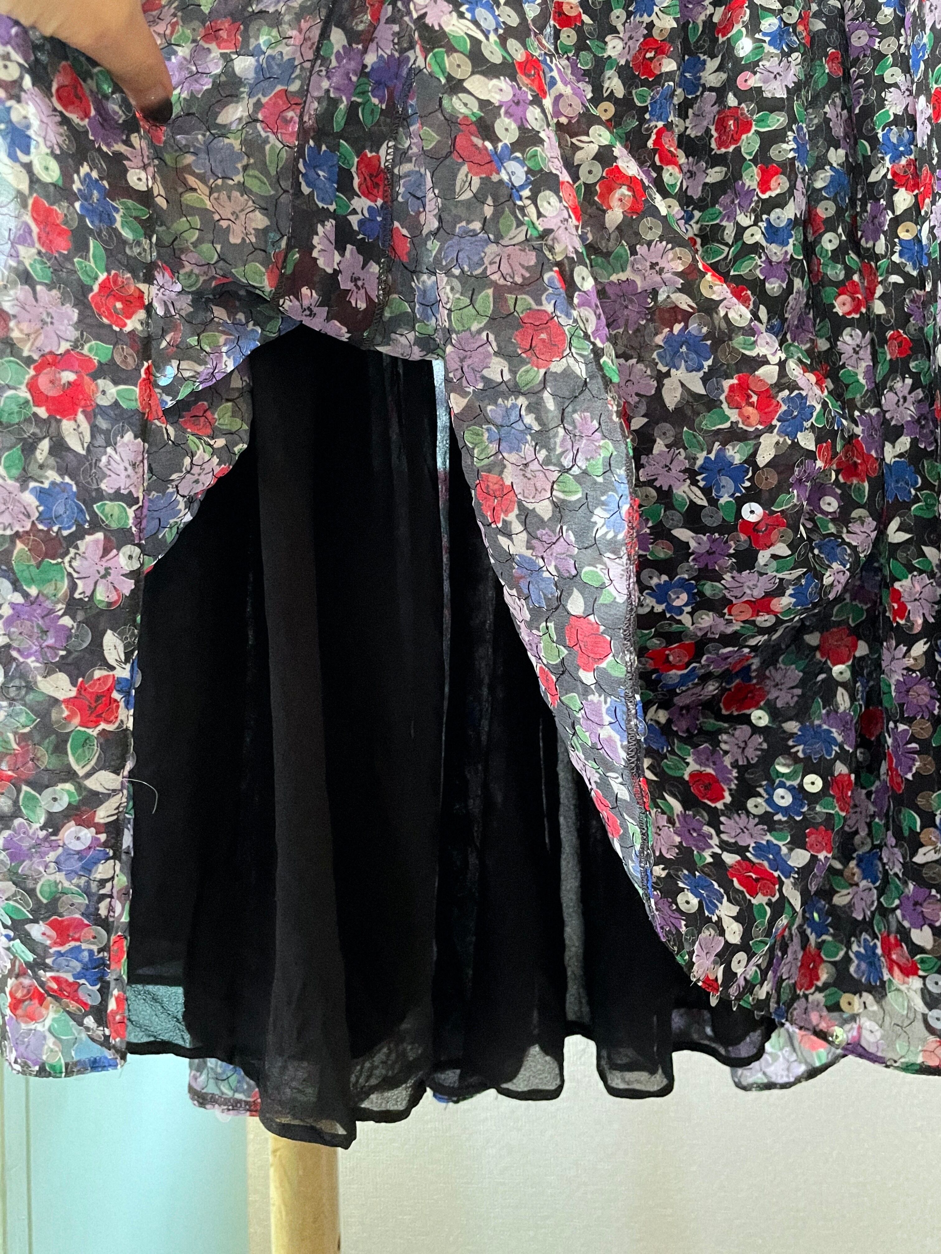 黒ベースの花柄テキスタイルにクリアのスパンコールが装飾されたスカート。
