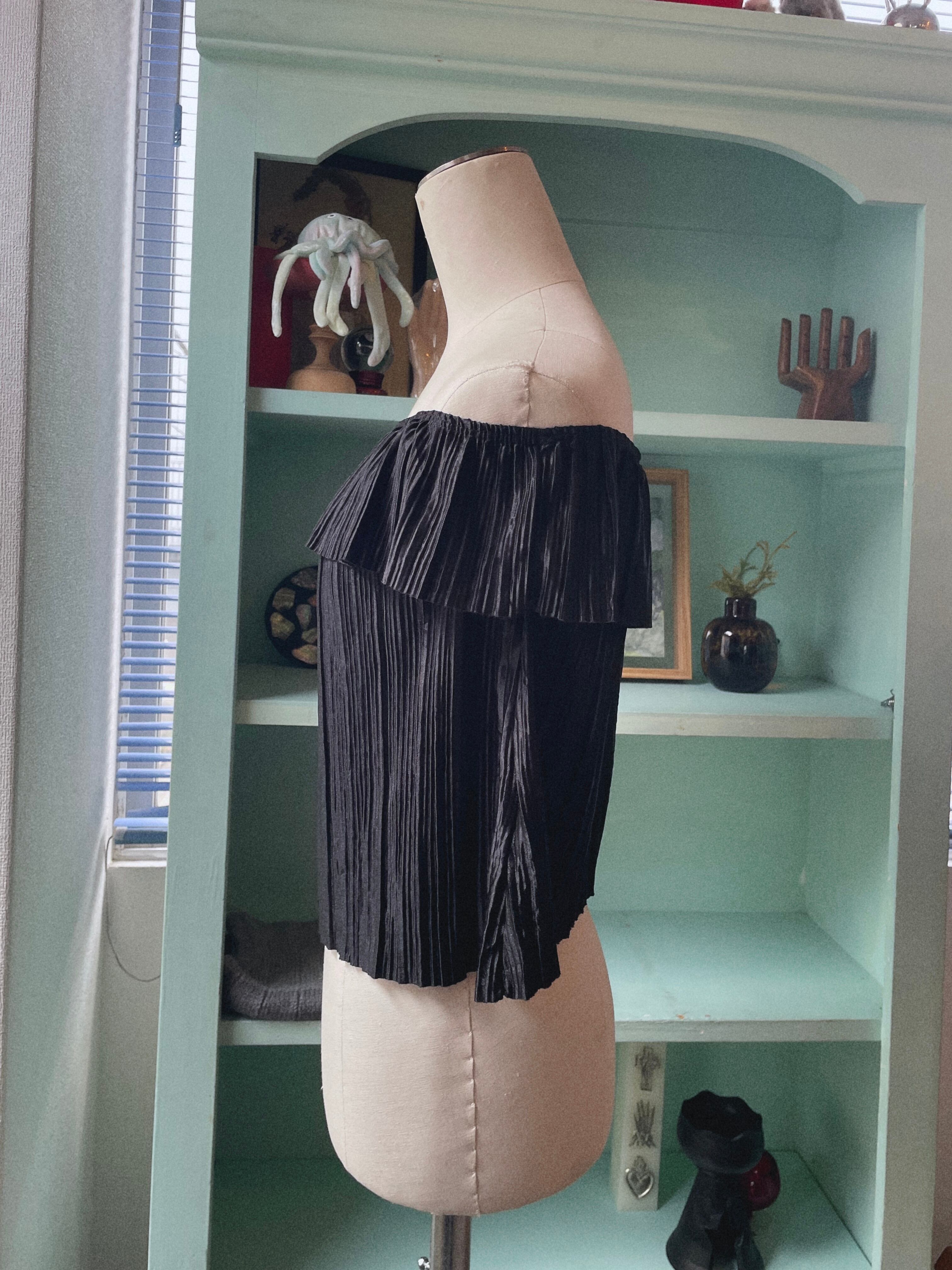 細かいプリーツ生地っぽいオフショルトップス。肩を上げてスクエアネックでも着られます。