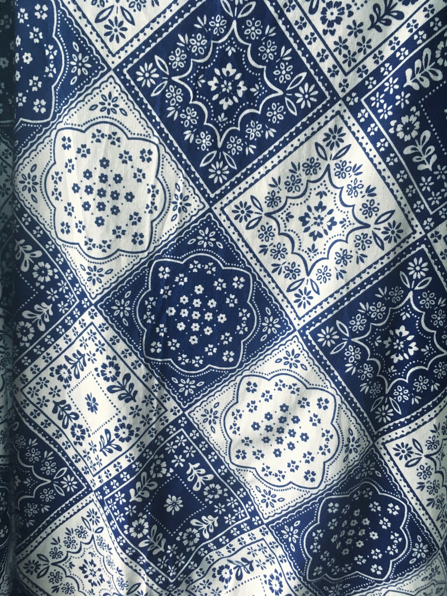 リゾートっぽい雰囲気で白とネイビーのタイルの様な柄のテキスタイルが可愛いです。