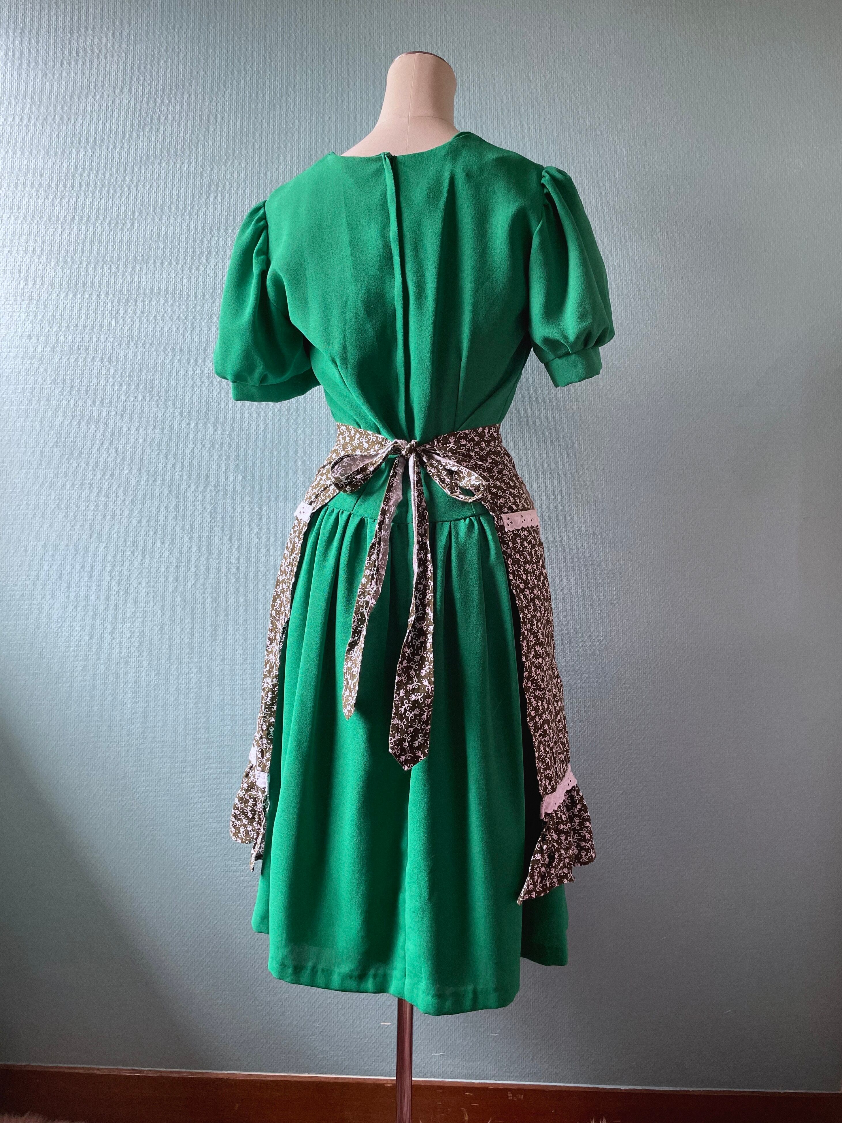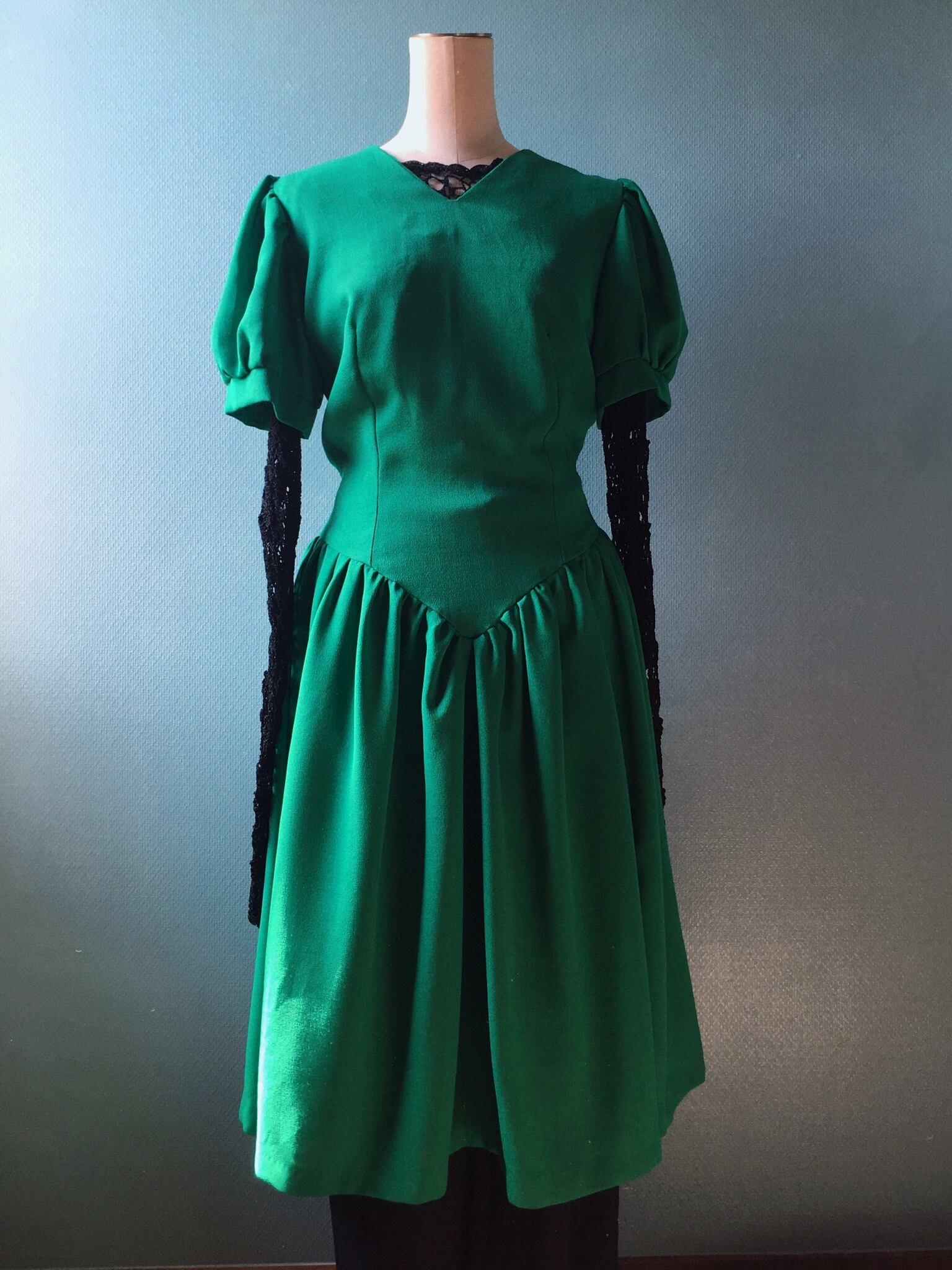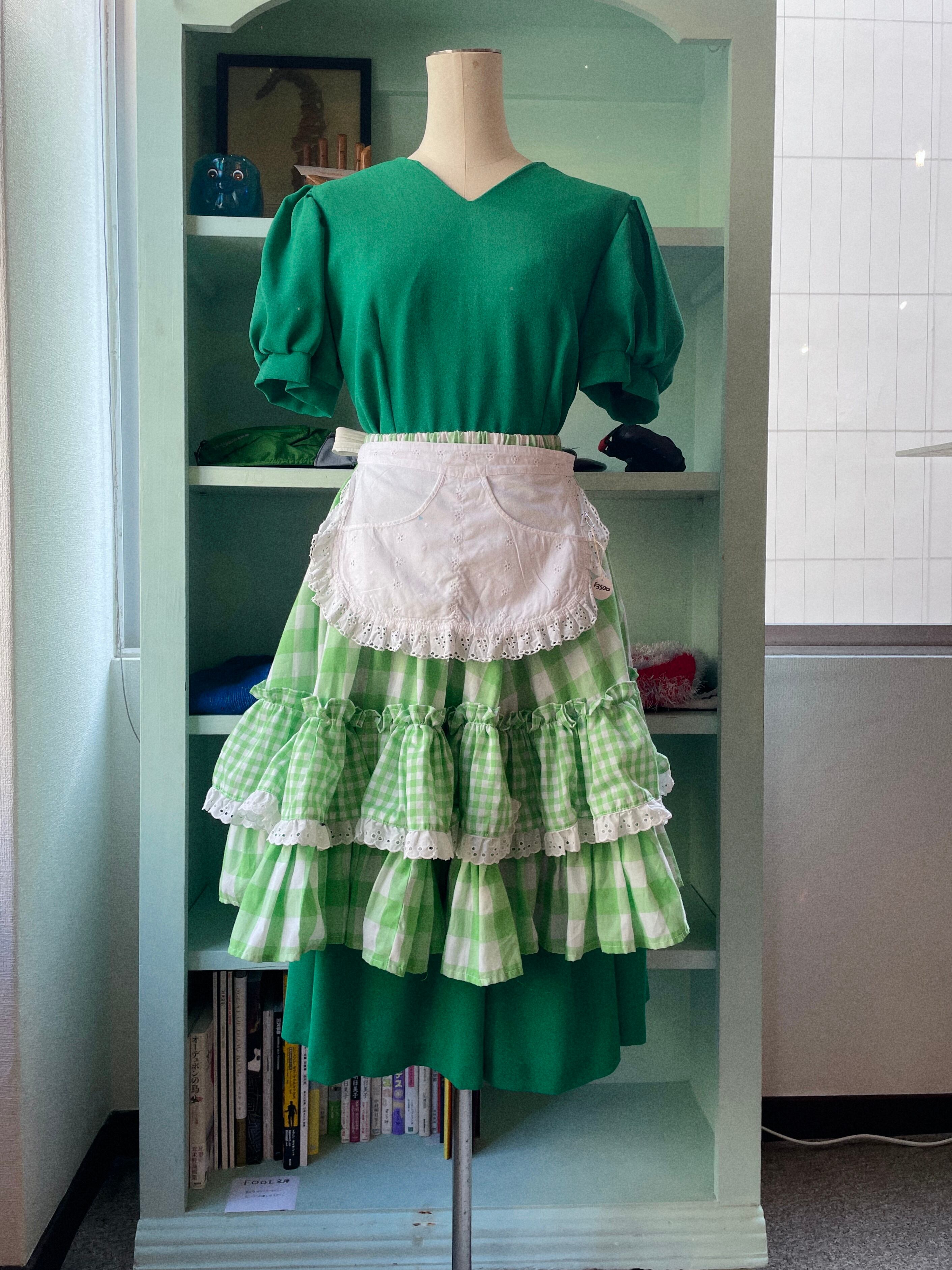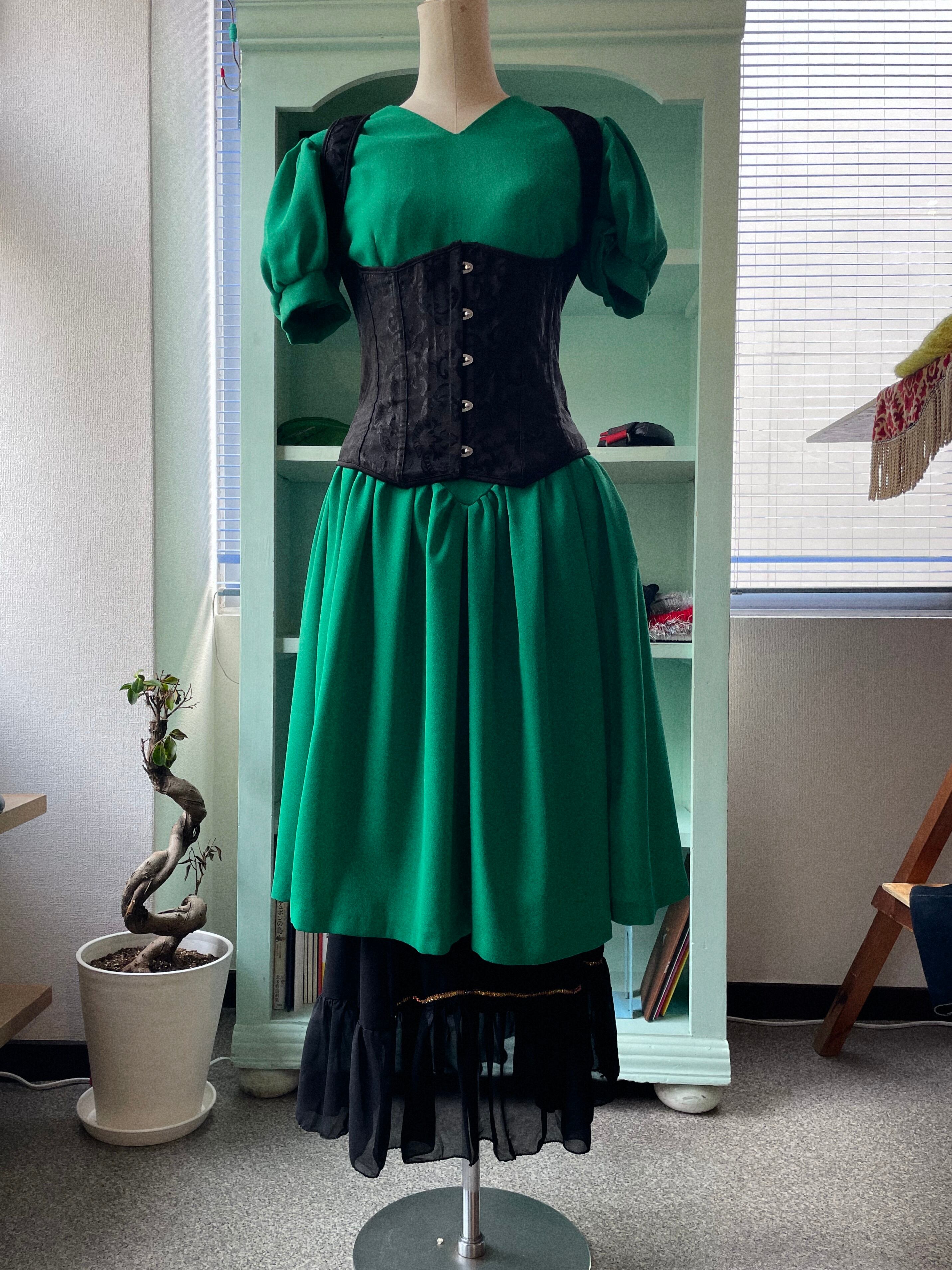 ウエストが絞ったデザインのワンピース。まさにグリーンな色味です。