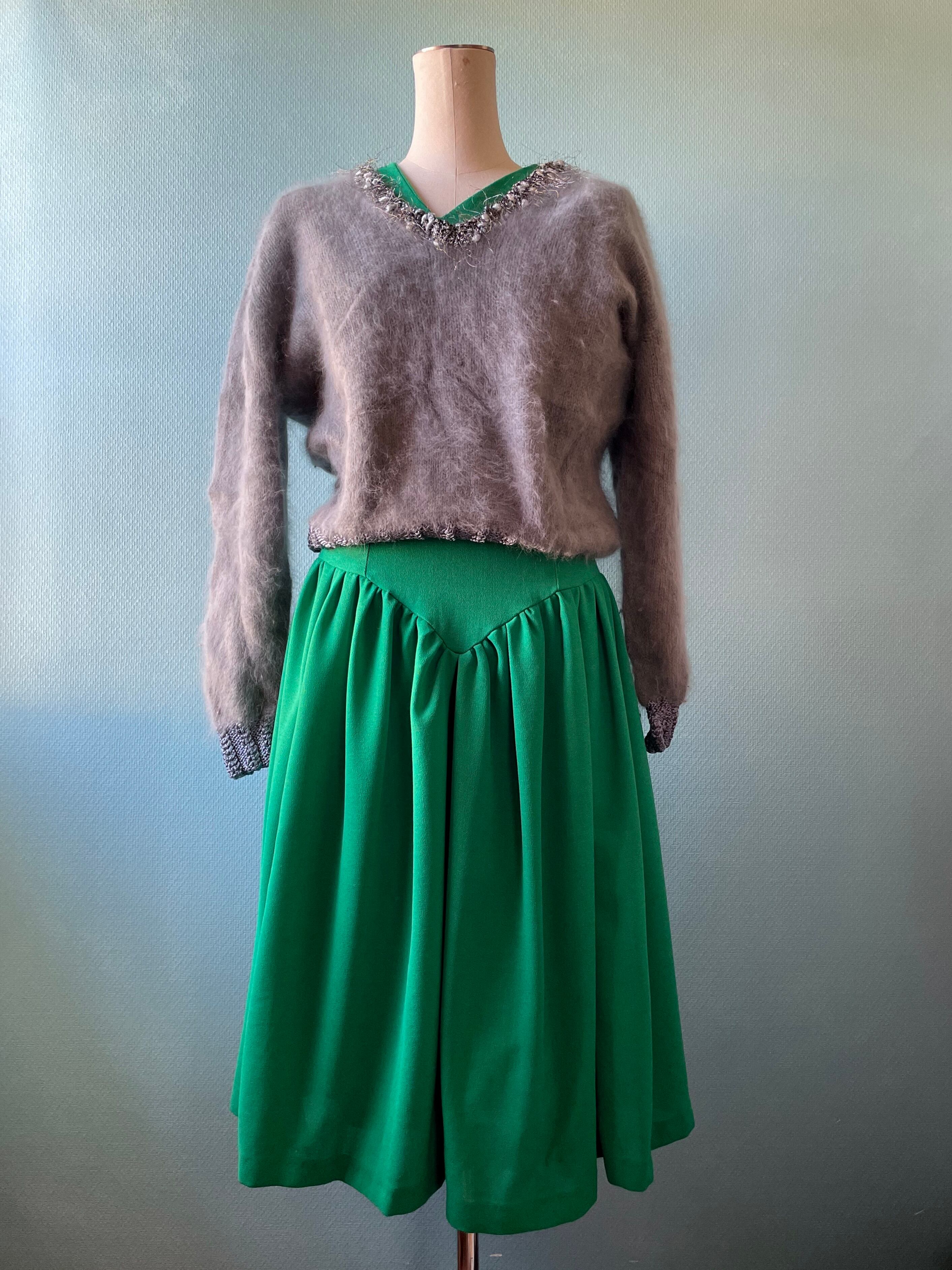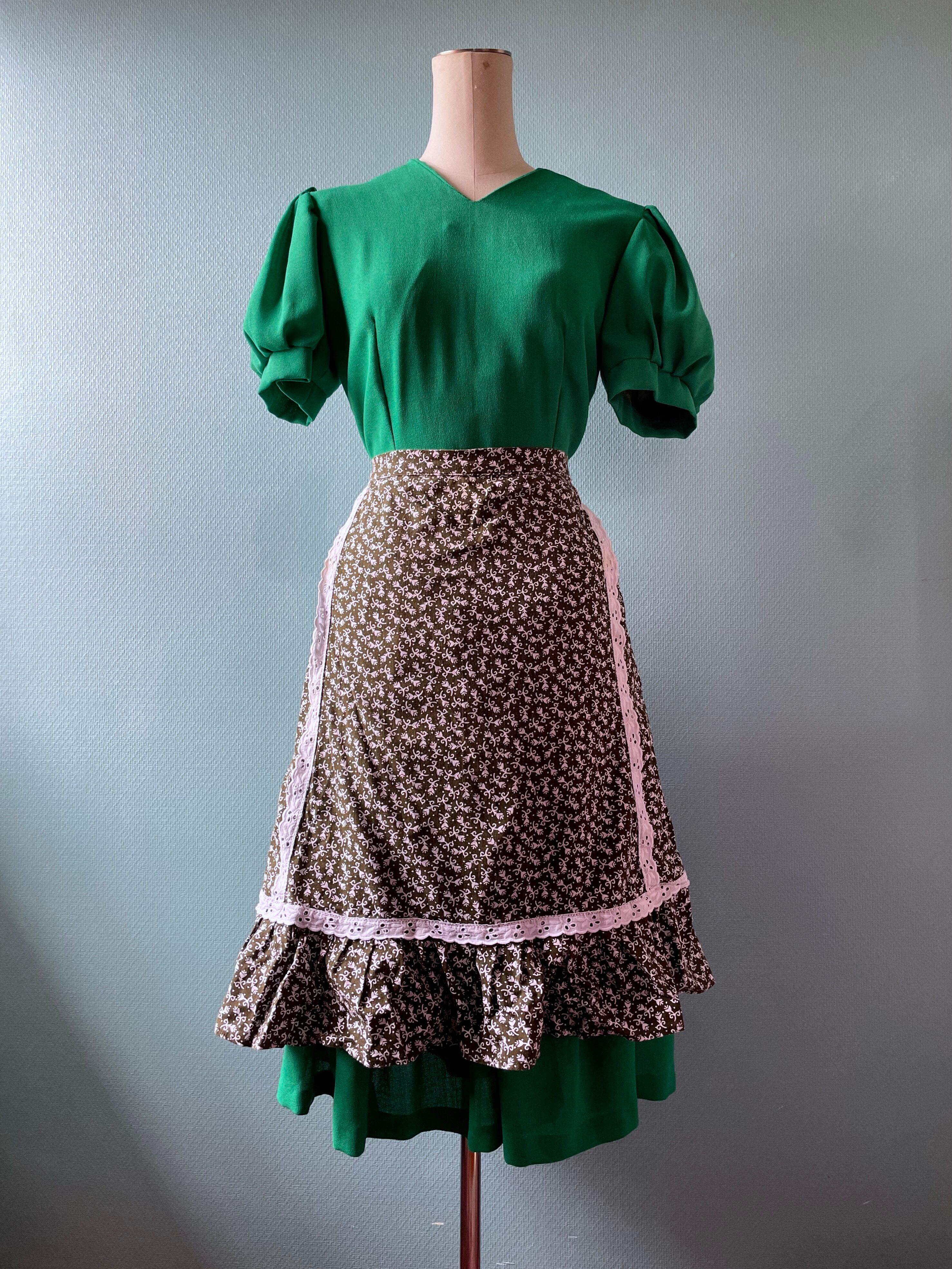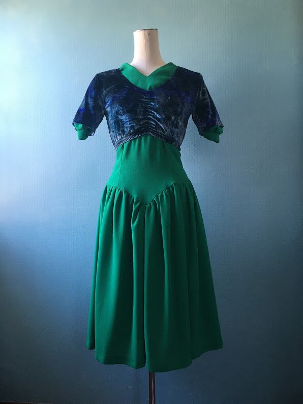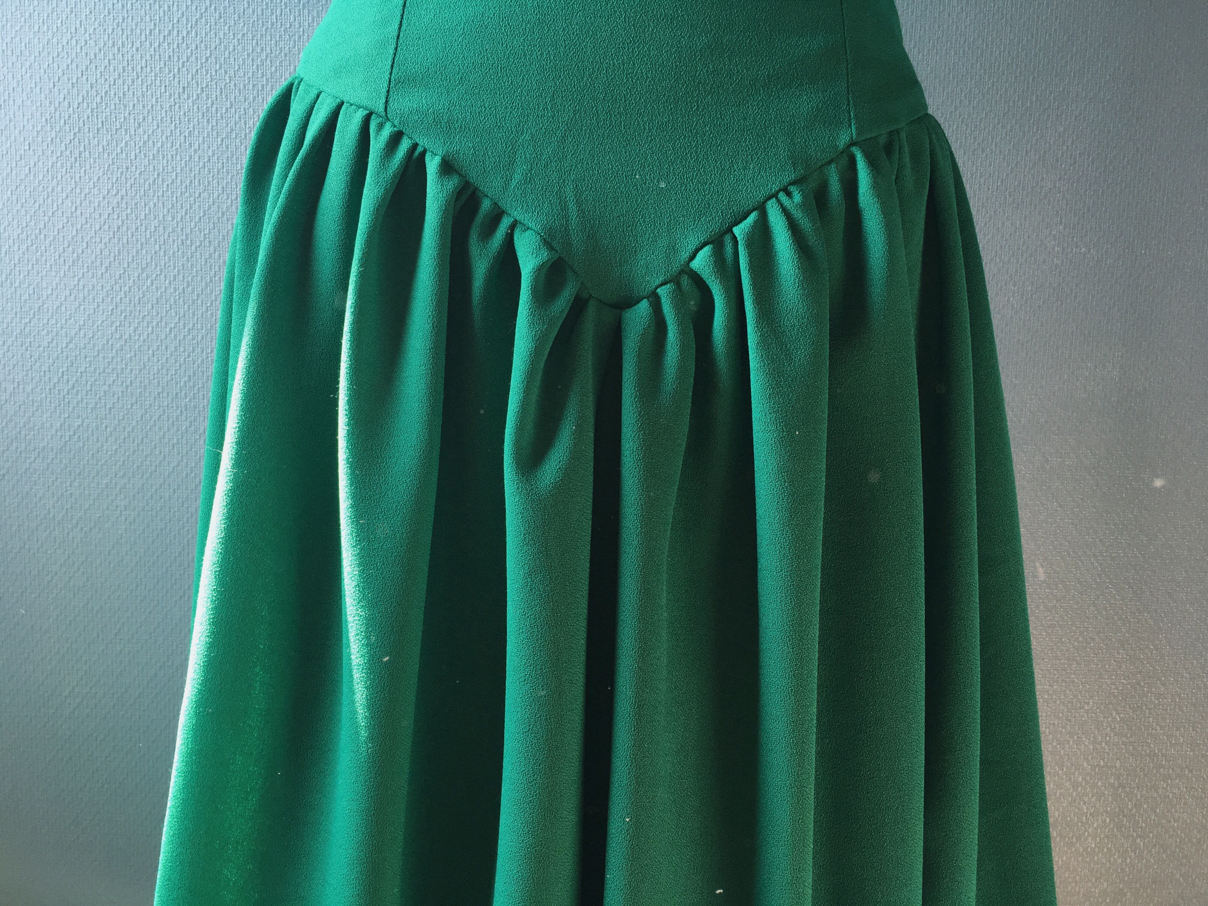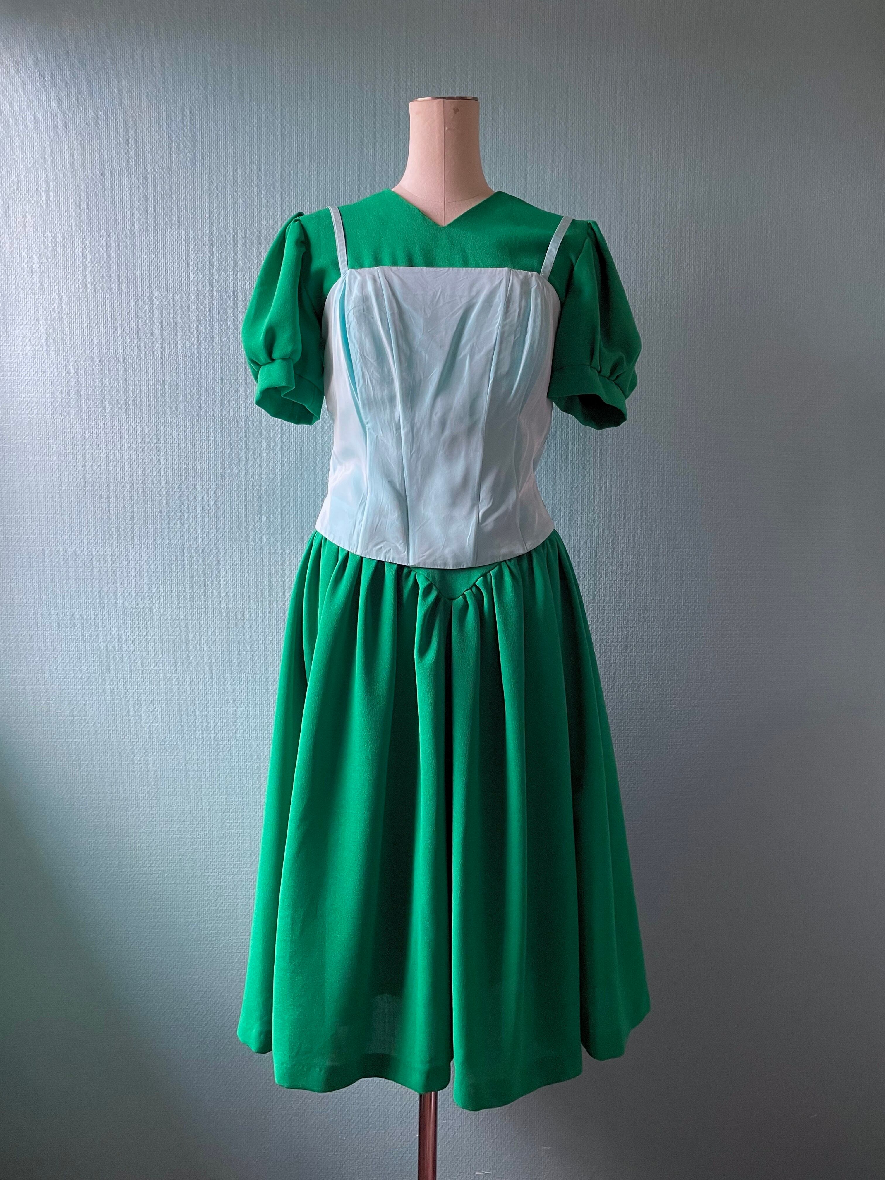ウエストが絞ったデザインのワンピース。まさにグリーンな色味です。