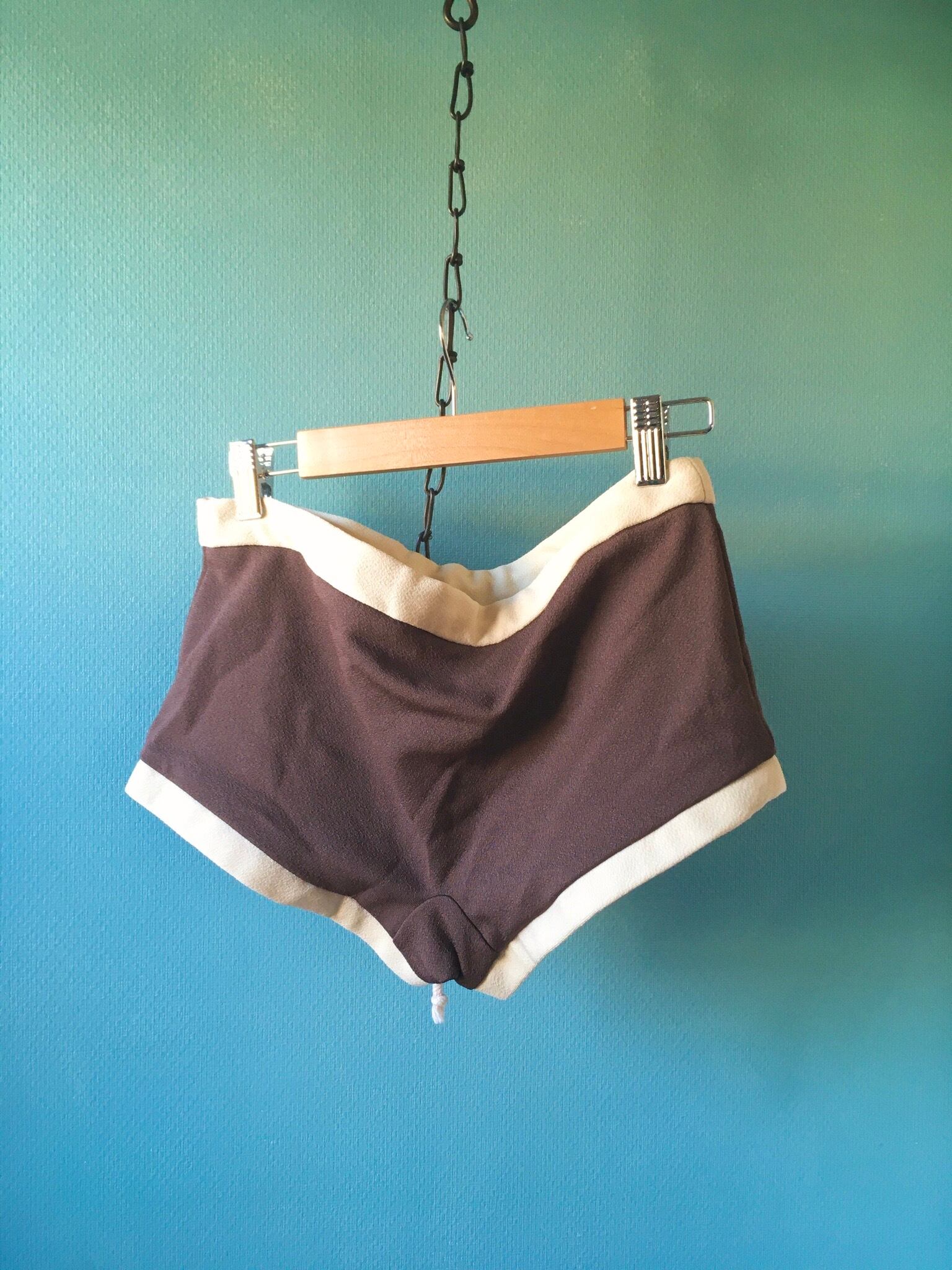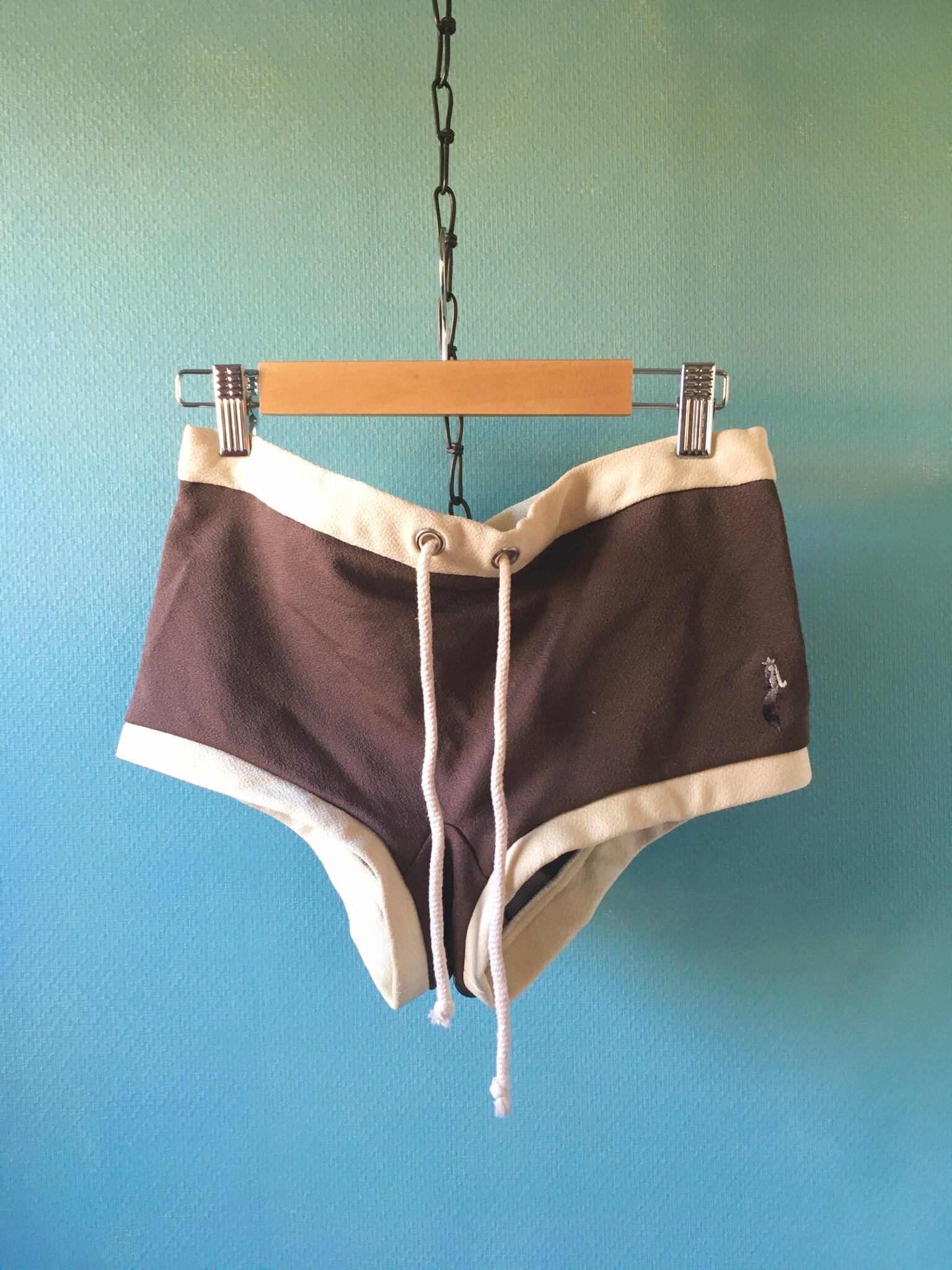 ベージュとブラウンカラーのスイムウェアショートパンツ。