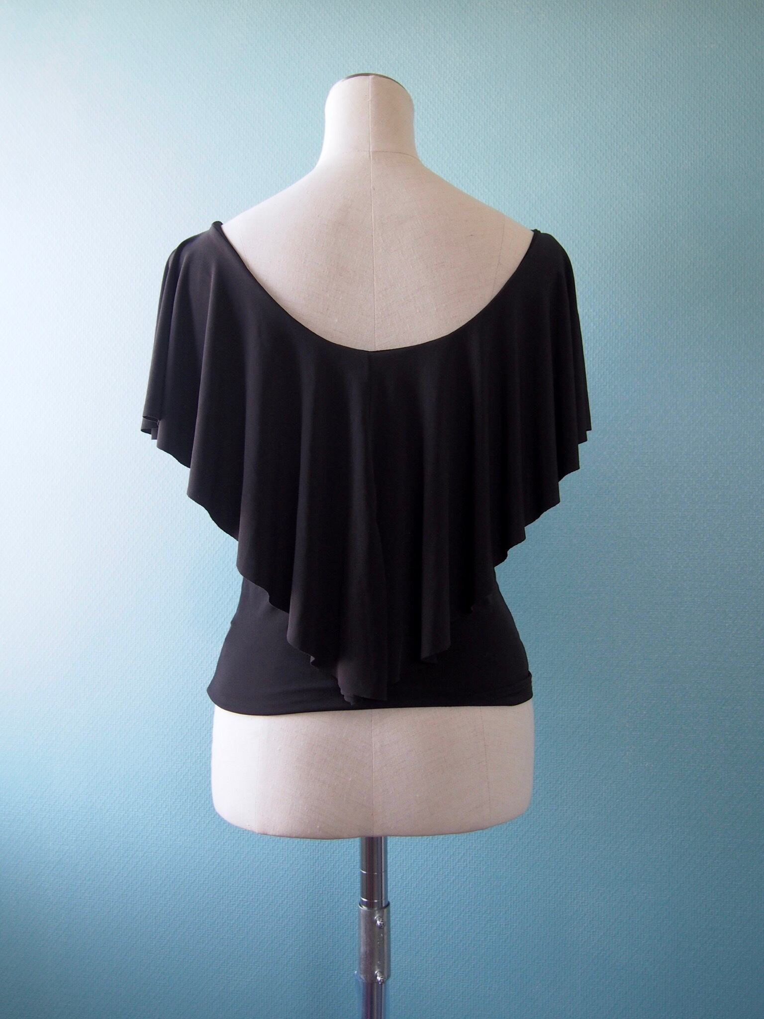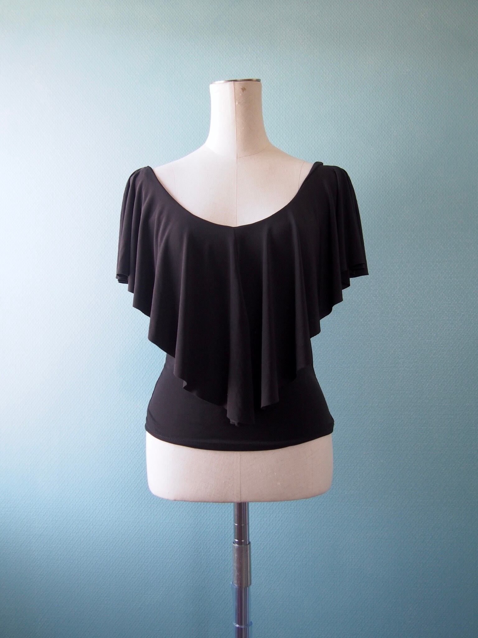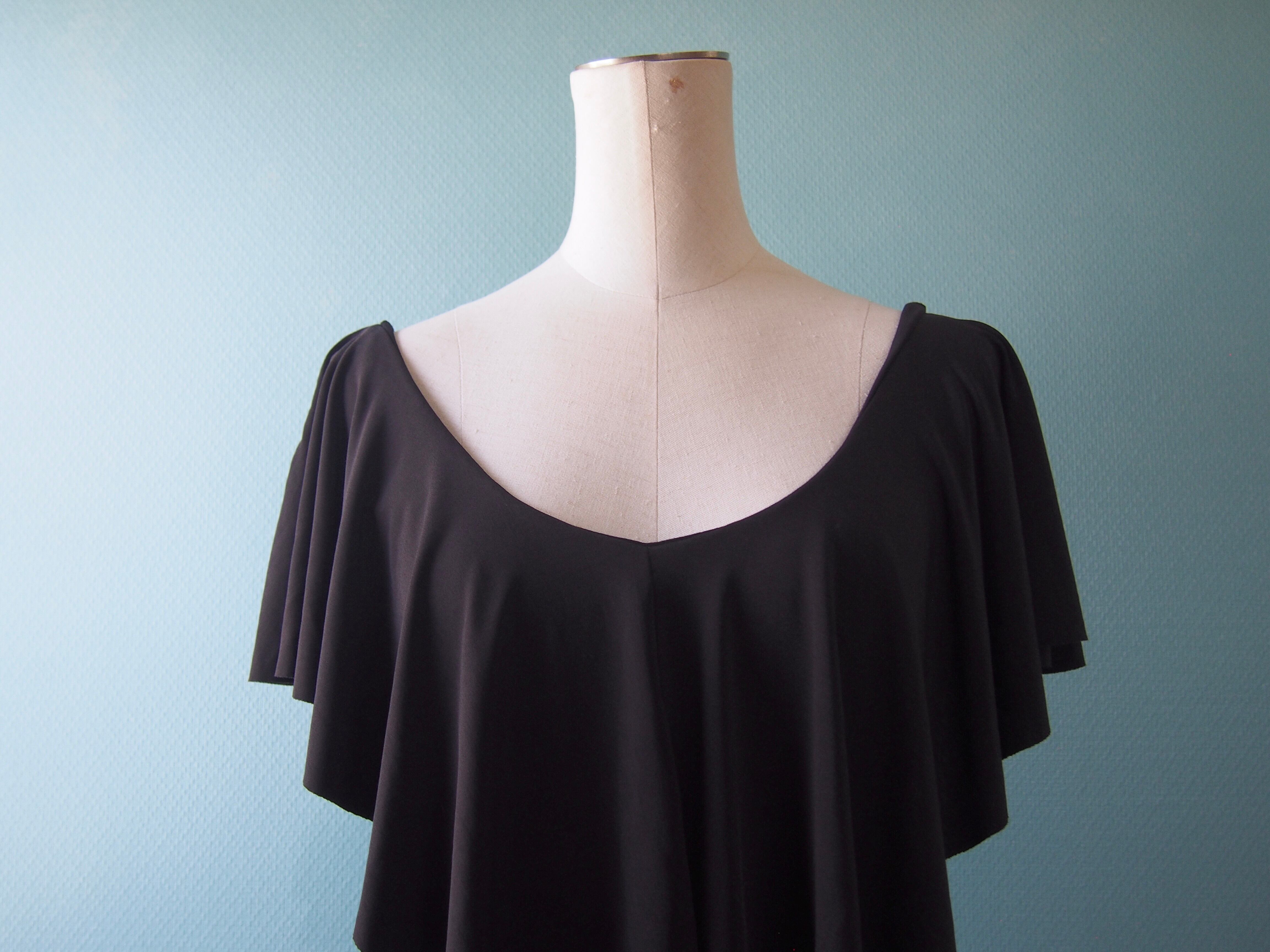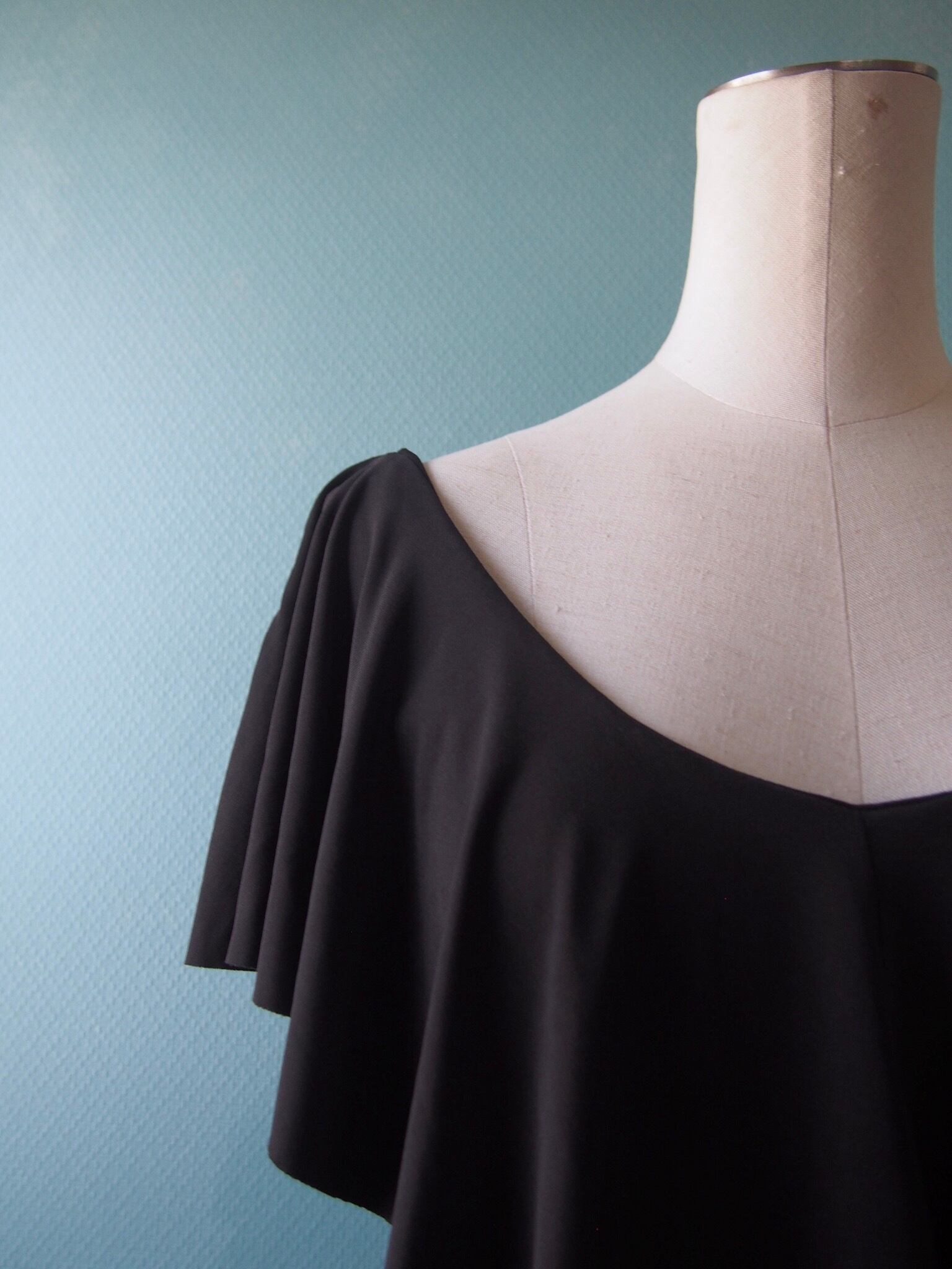 タンクトップの襟首の周りにフリルを飾ったようなデザインのトップス。