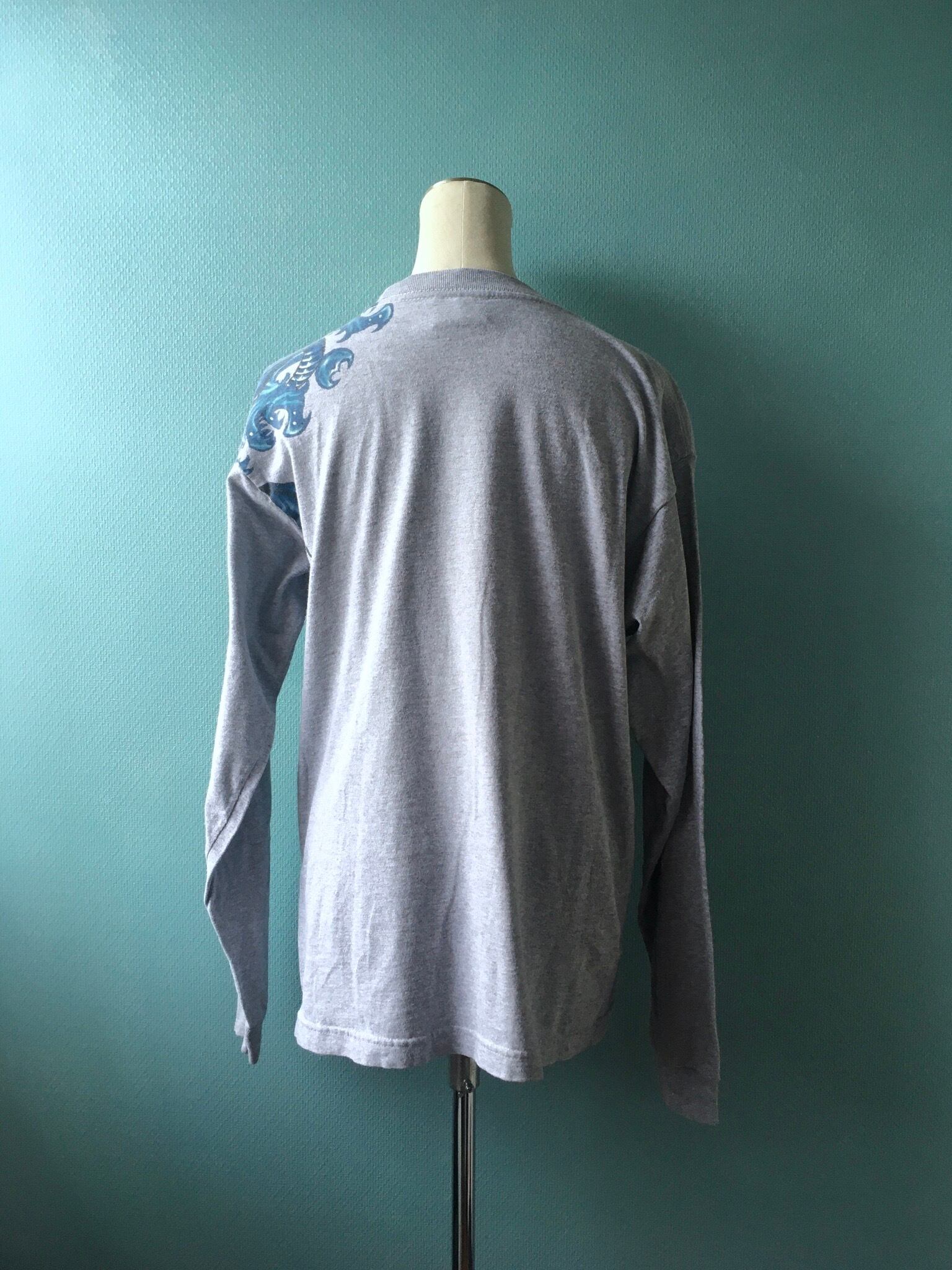 グレーのロング Tシャツ。肩からドラゴン柄が入ってます。