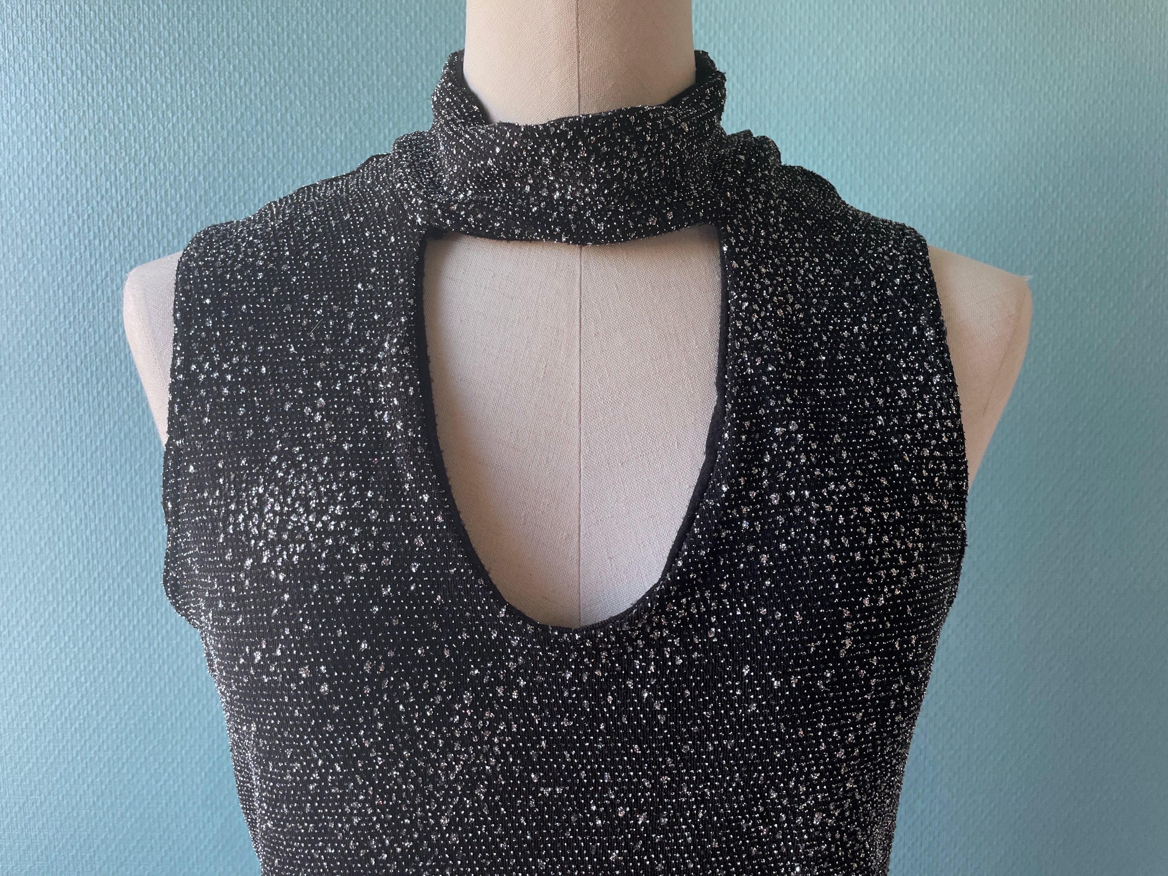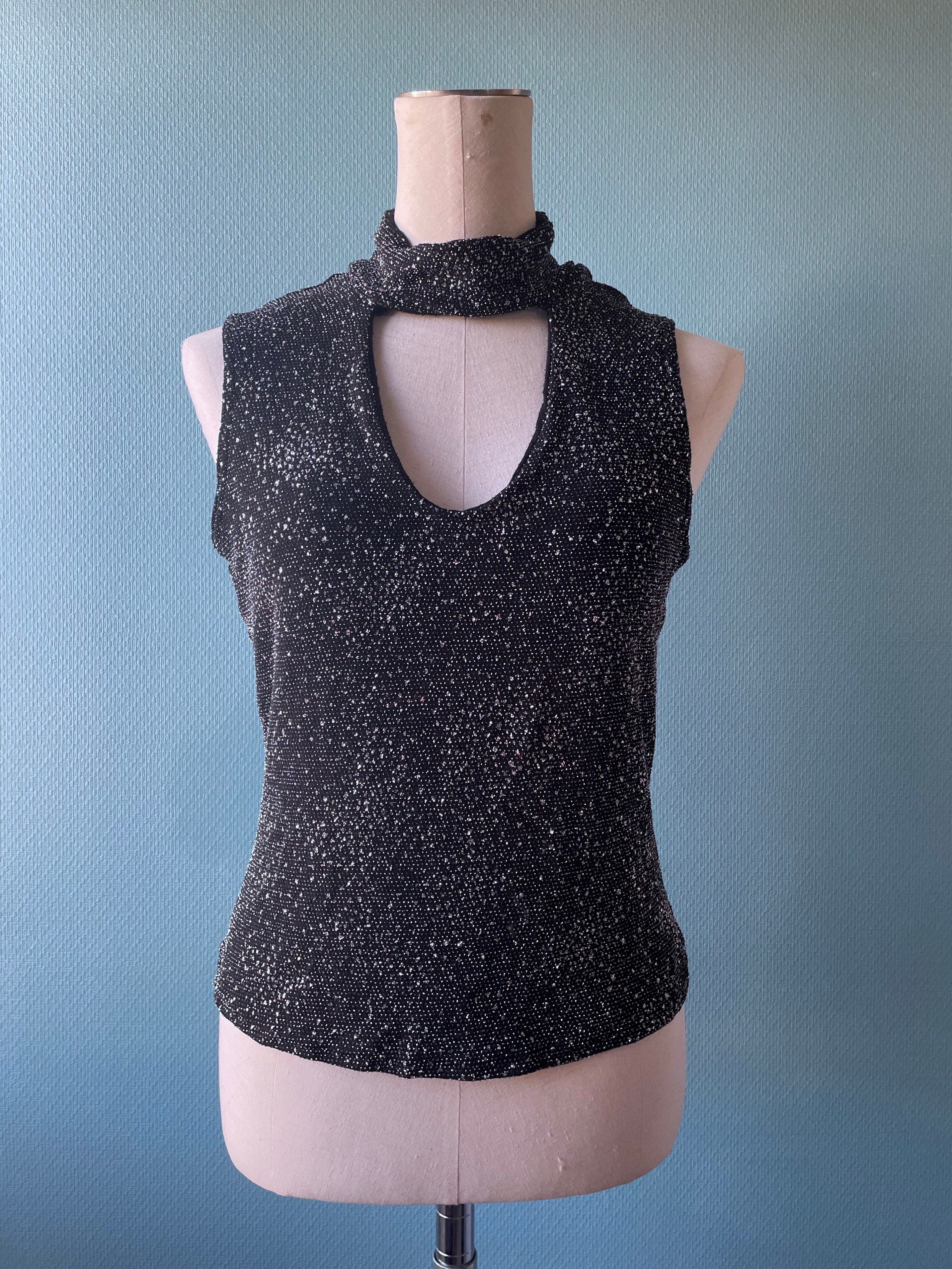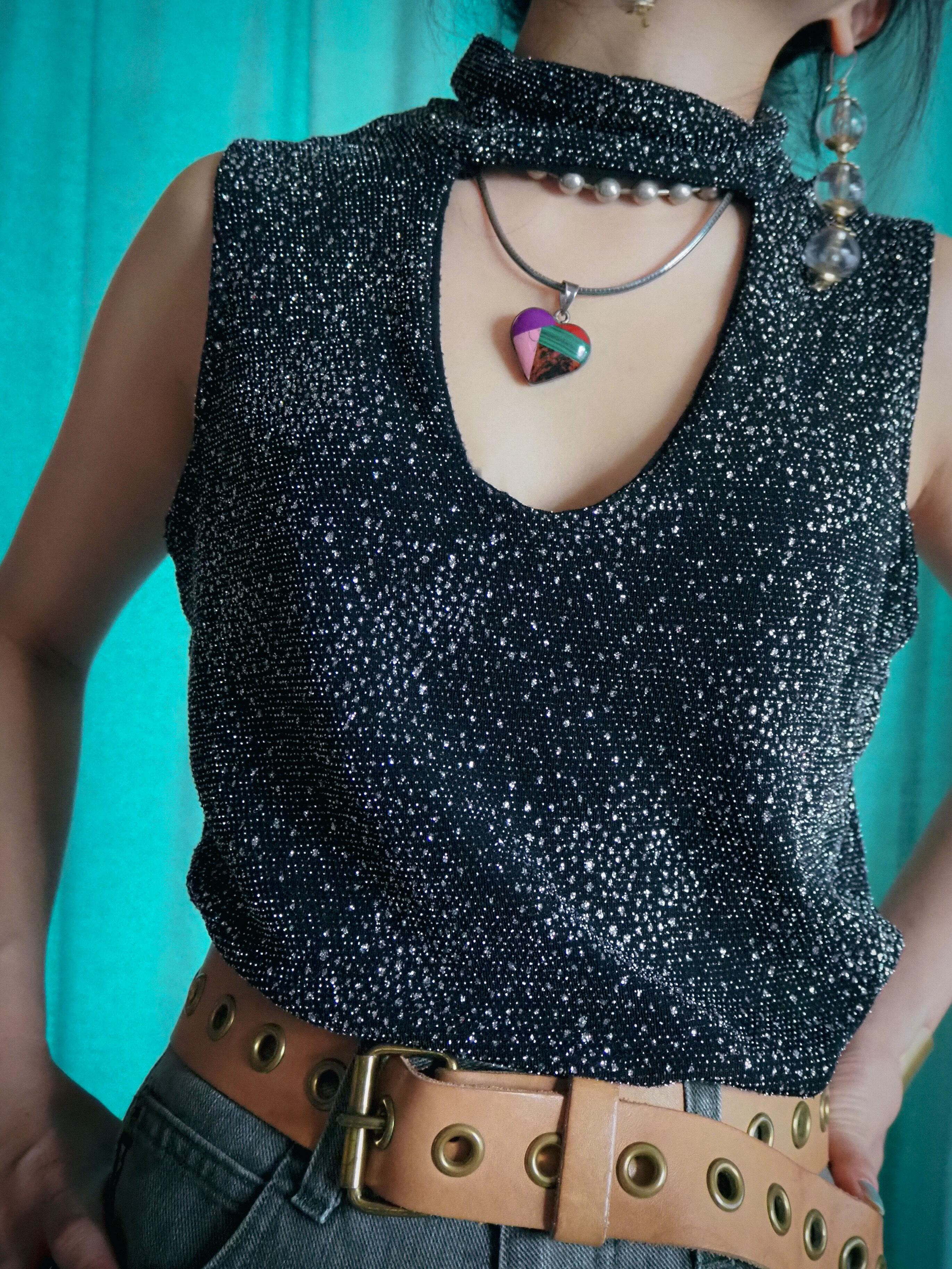 黒地にシルバーのラメ入り、カットアウトデザインのトップス。