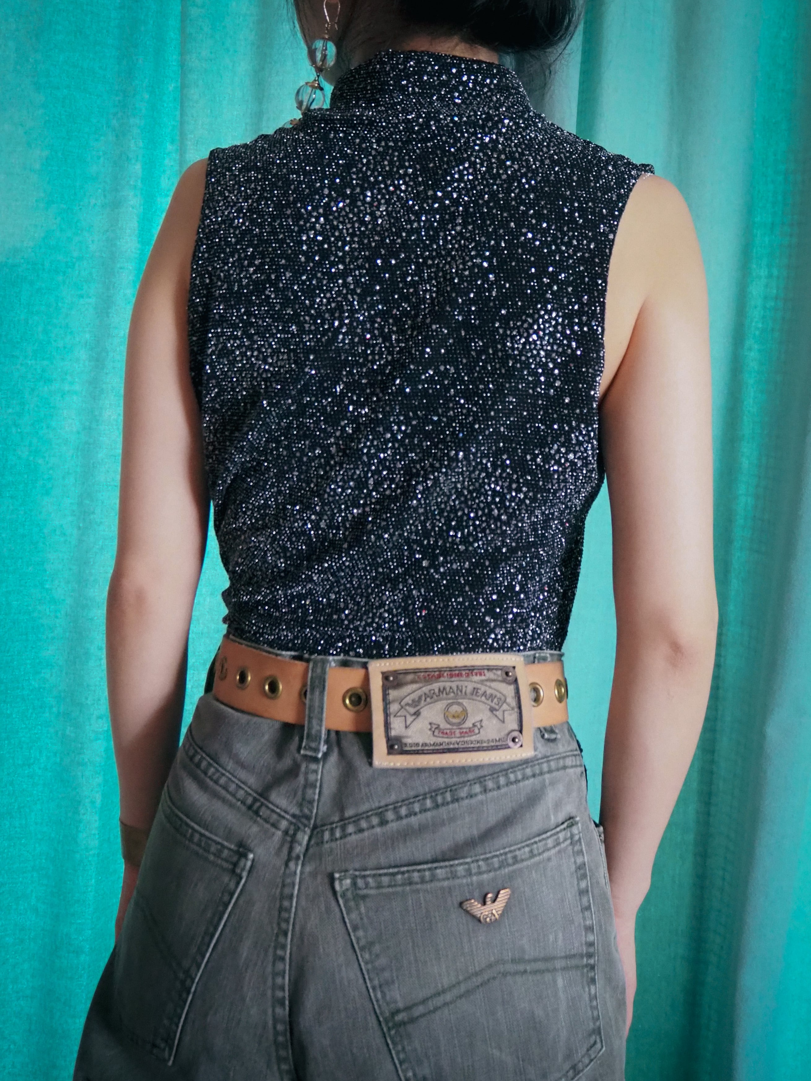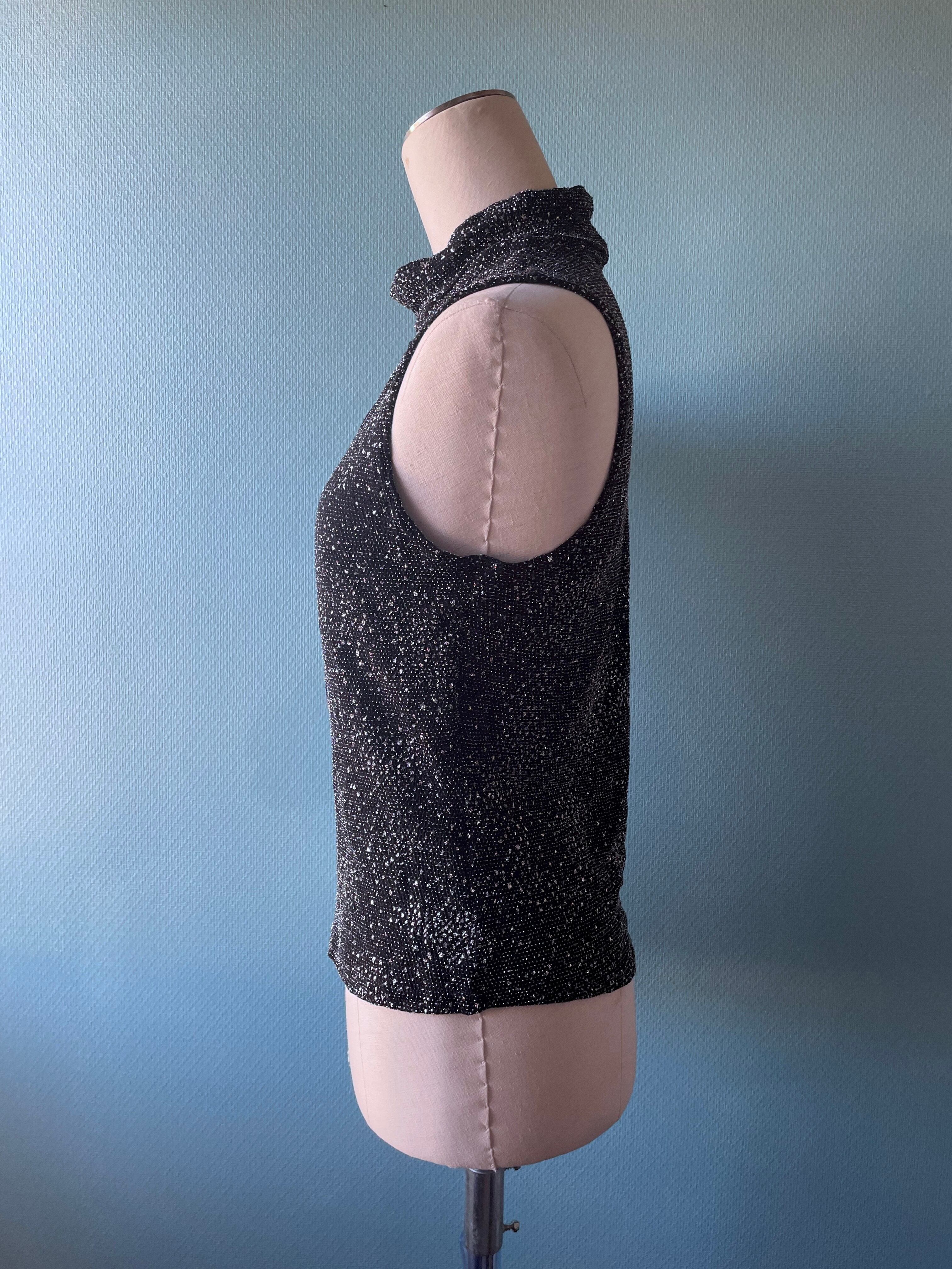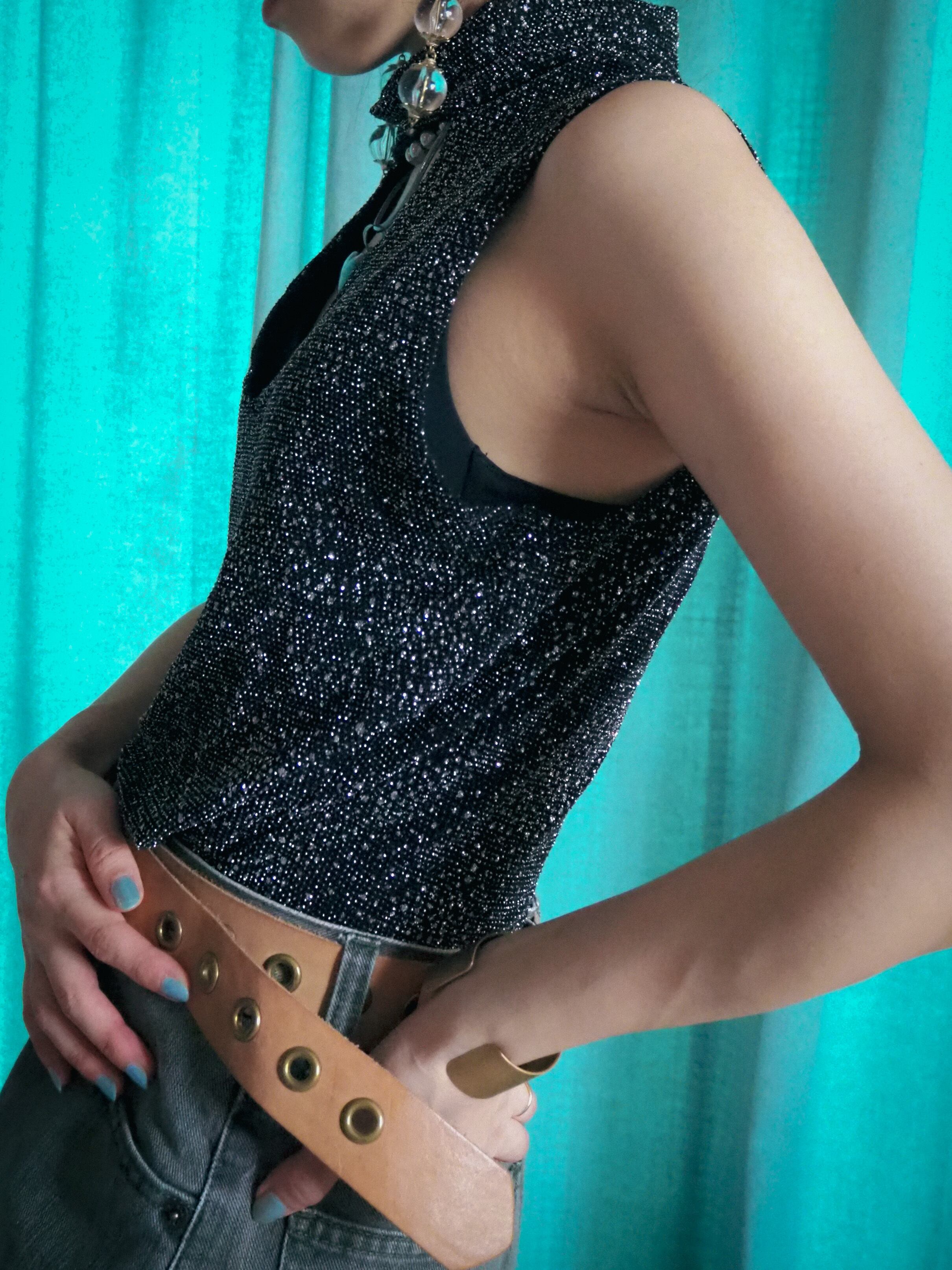 黒地にシルバーのラメ入り、カットアウトデザインのトップス。