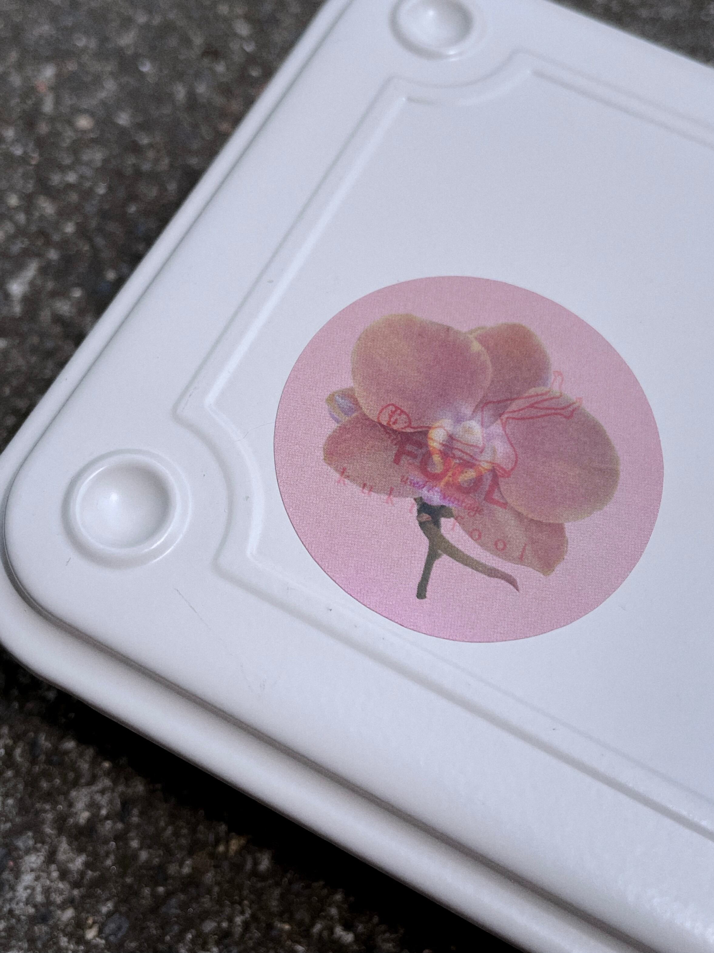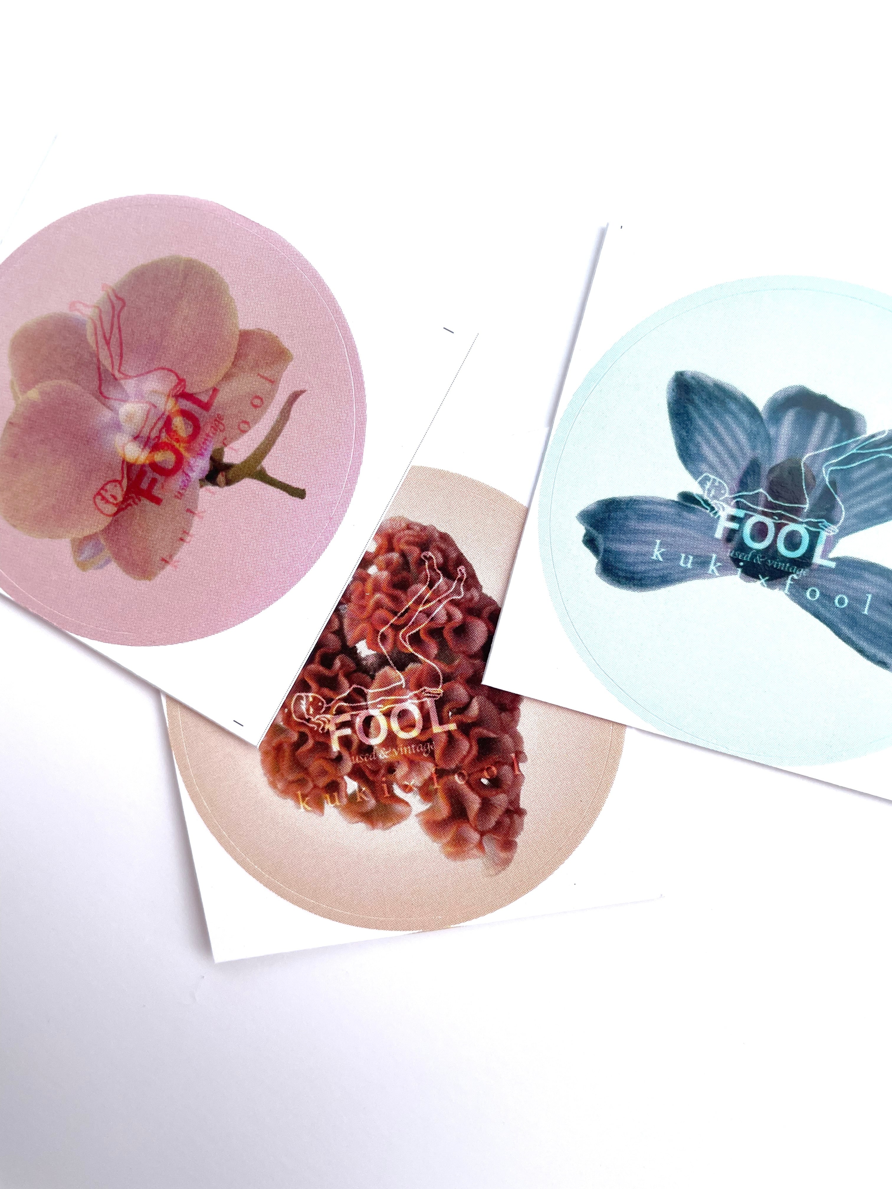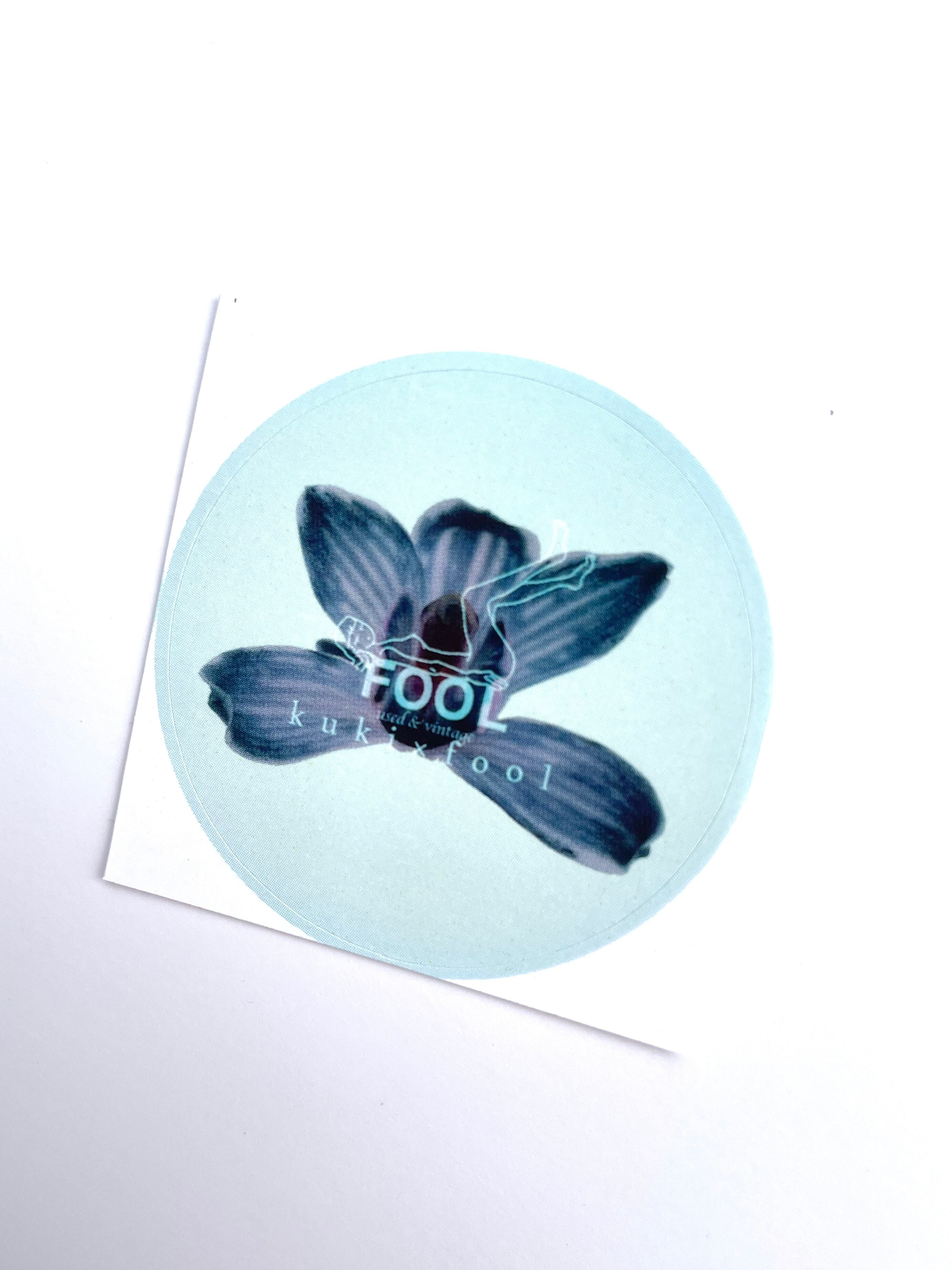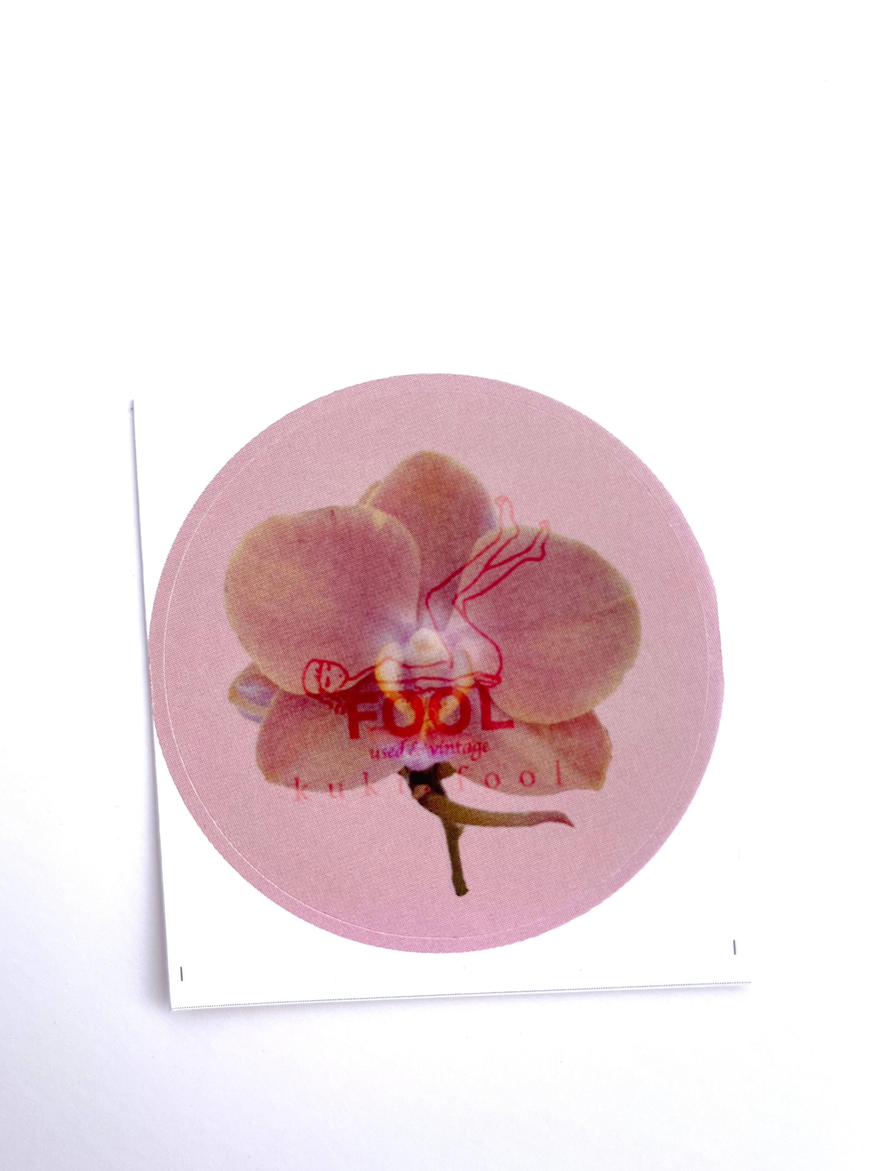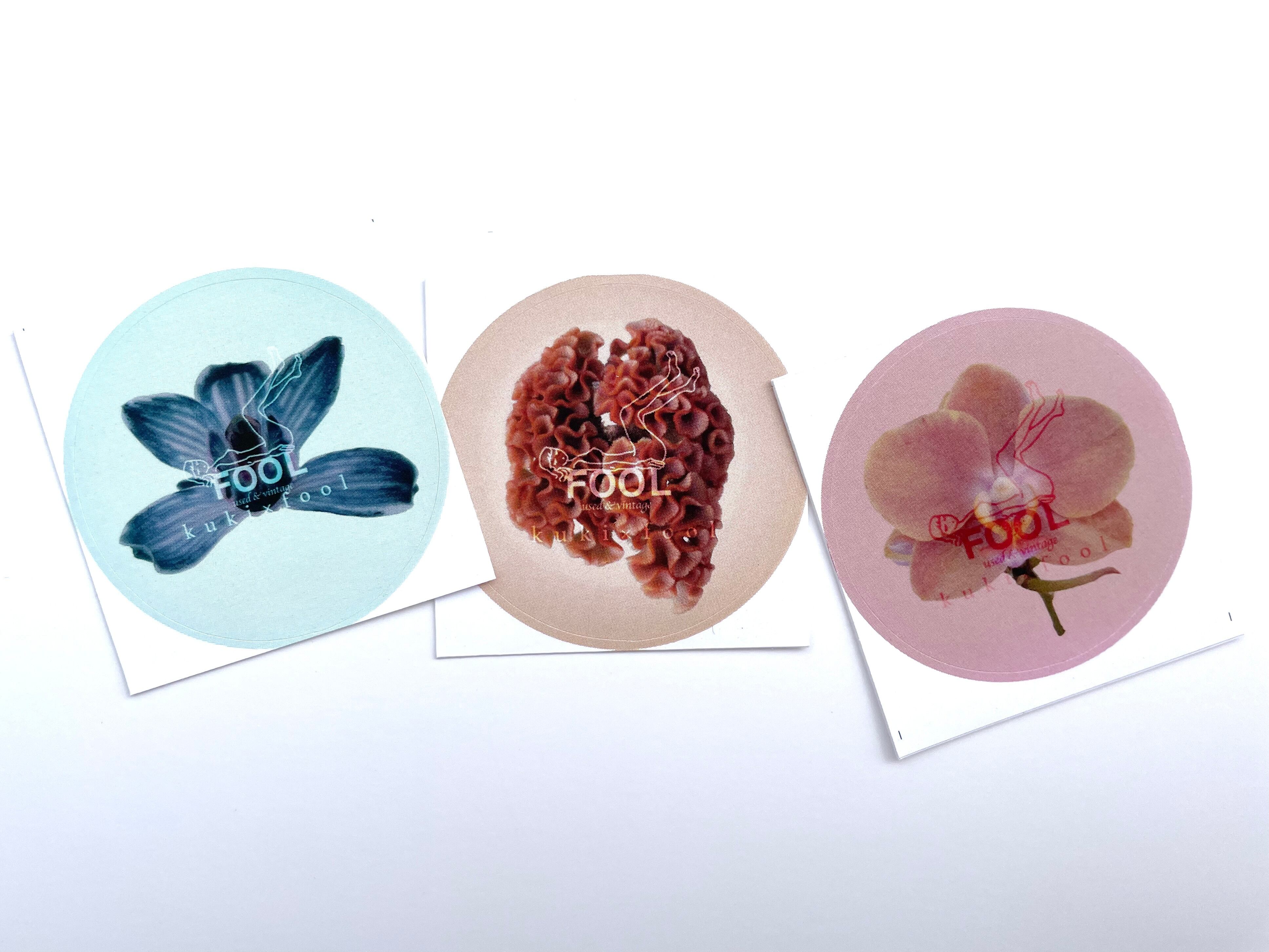 kukiのお花にFOOLのロゴをのせたステッカーです。